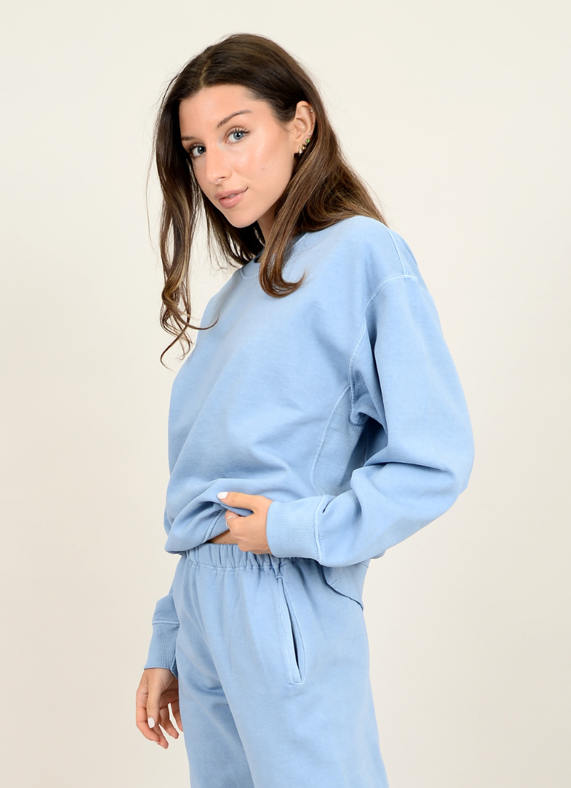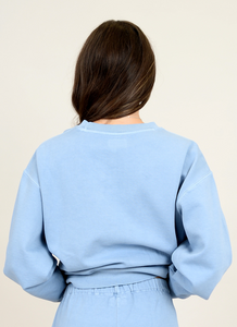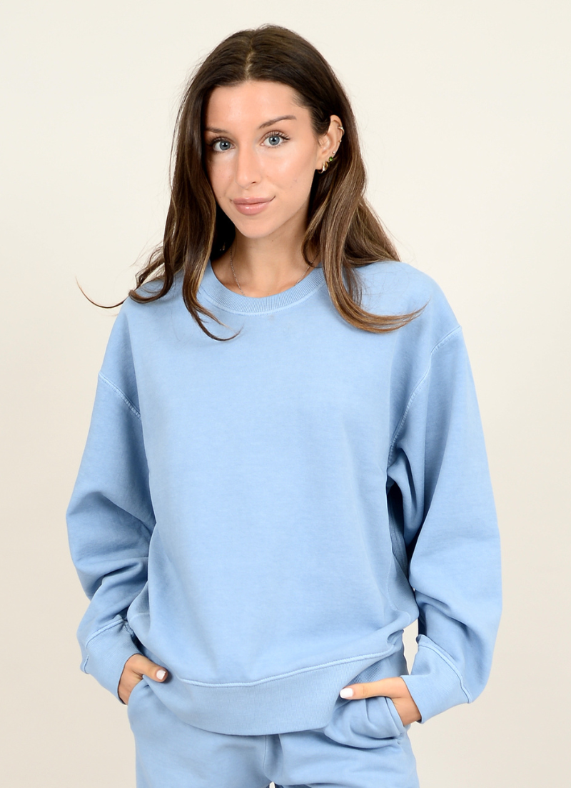 Stay cozy and cool in the Christa Sweatshirt. This light blue crew sweatshirt is perfect for lounging or running errands. Made from soft material, it's sure to be your new go-to for comfort and style.