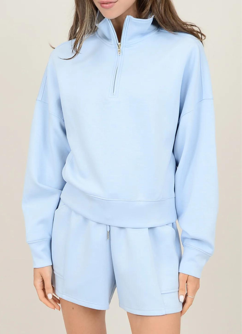 Discover superior comfort and style with our Mailyn Soft Scuba Quarter Zip in the calming shade of Bluebell. Made with butter soft material, this loungewear essential features a convenient quarter zip for added ease. Relax and unwind in luxurious comfort, perfect for any occasion.