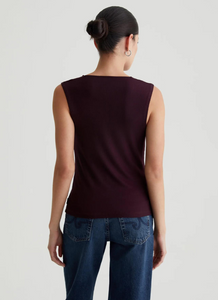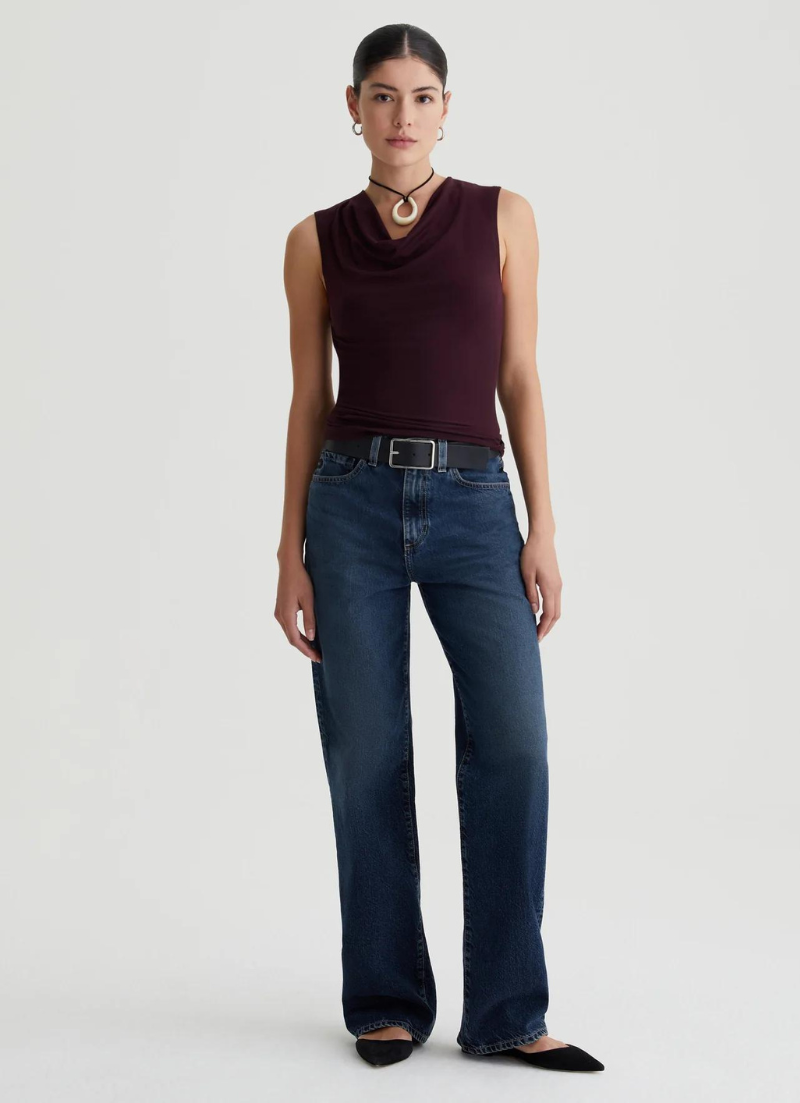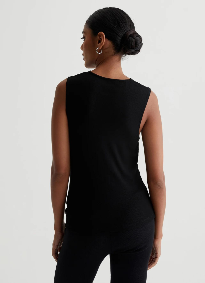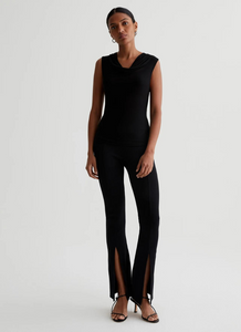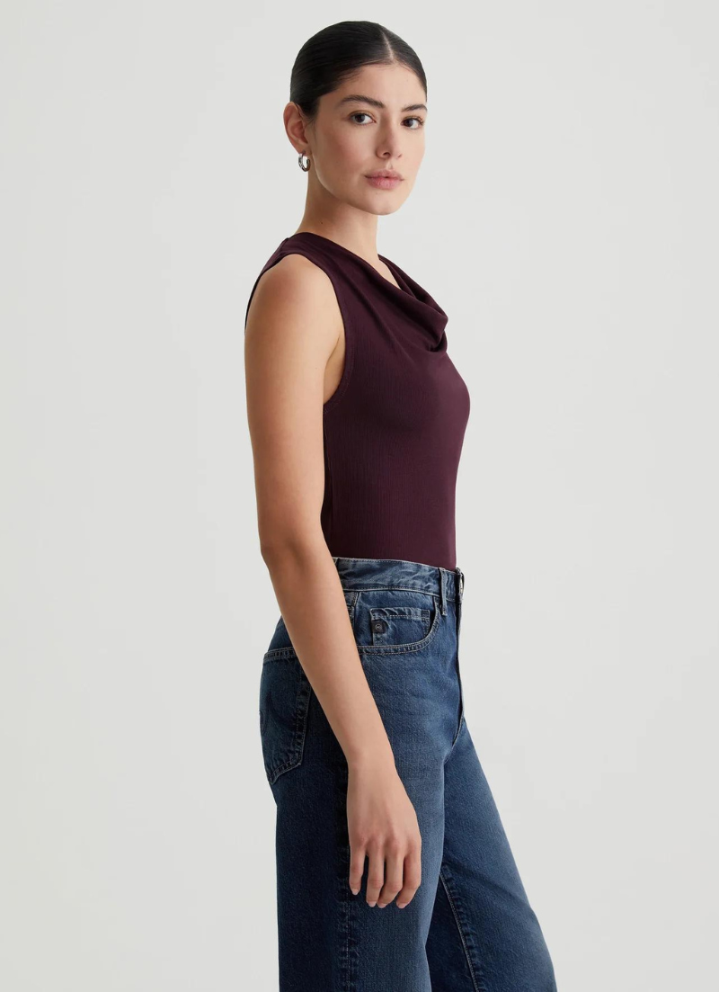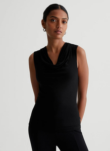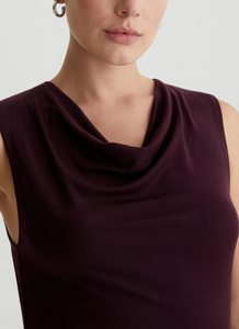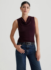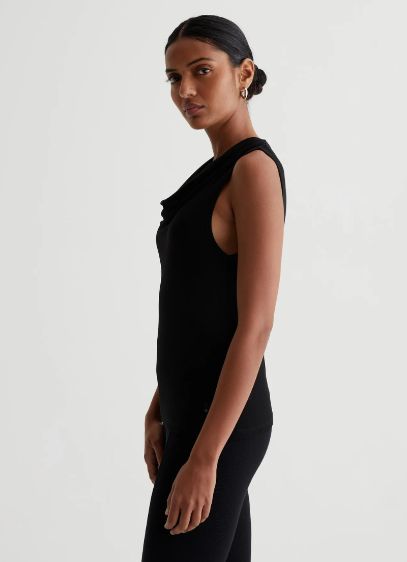 The Vibia Top has a slim fit with a draped cowl neckline. It's cut on the bias in 2x1 Lyocell Rib for an ultra-flattering silhouette and soft stretch comfort. The models are wearing size S.