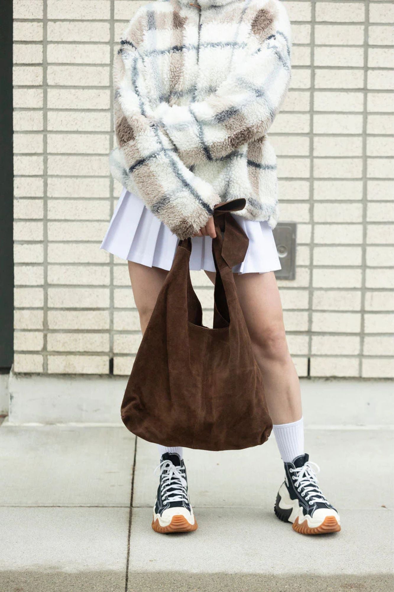The elegant RISA knot tote is expertly handcrafted by female artisans using luxurious upcycled suede leather. Its spacious design effortlessly holds your everyday essentials and travel necessities, while the knotted strap can be adjusted to your perfect length. Complete with a magnetic closure and zipper pocket, this hobo tote is both stylish and functional.