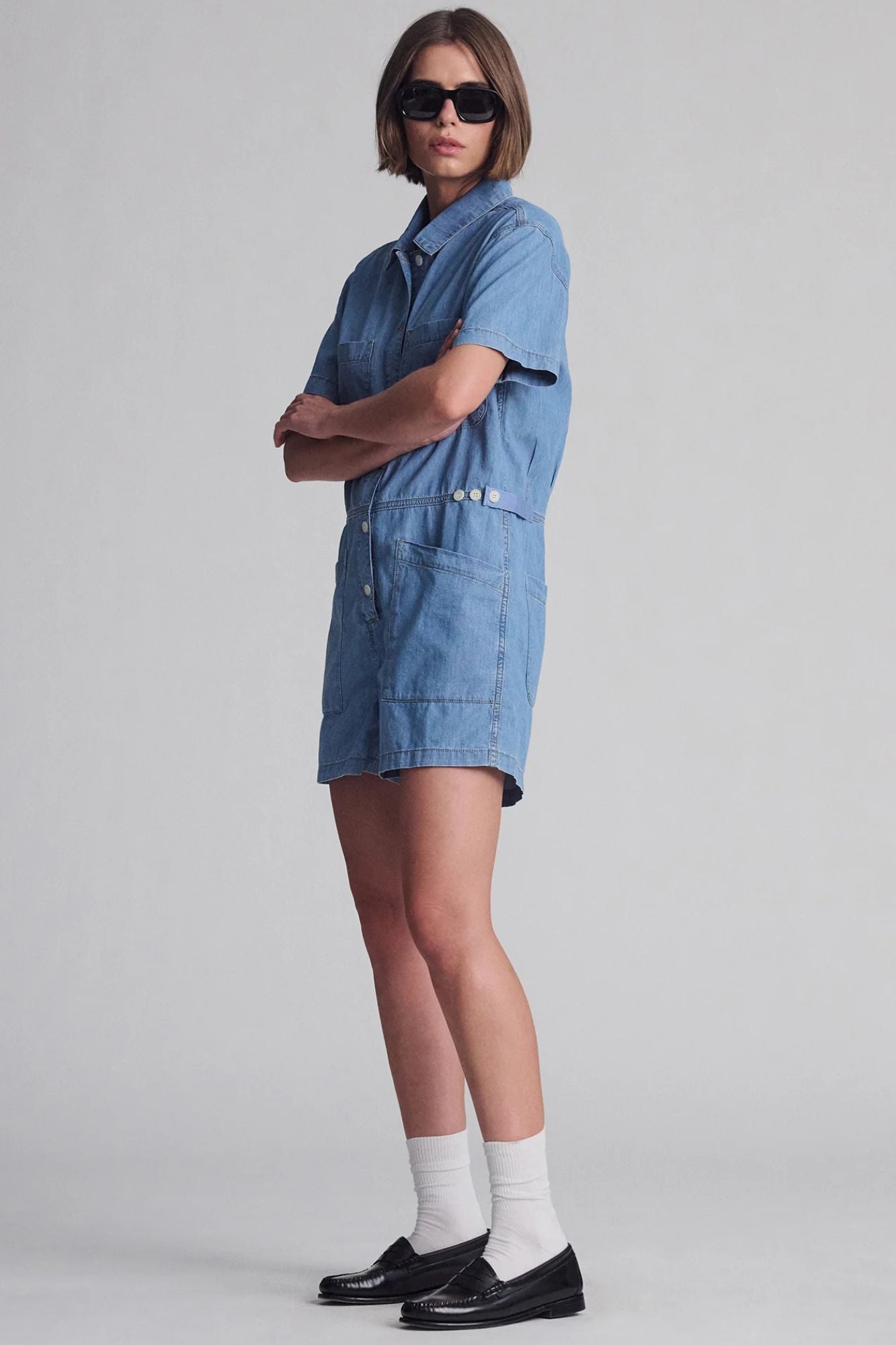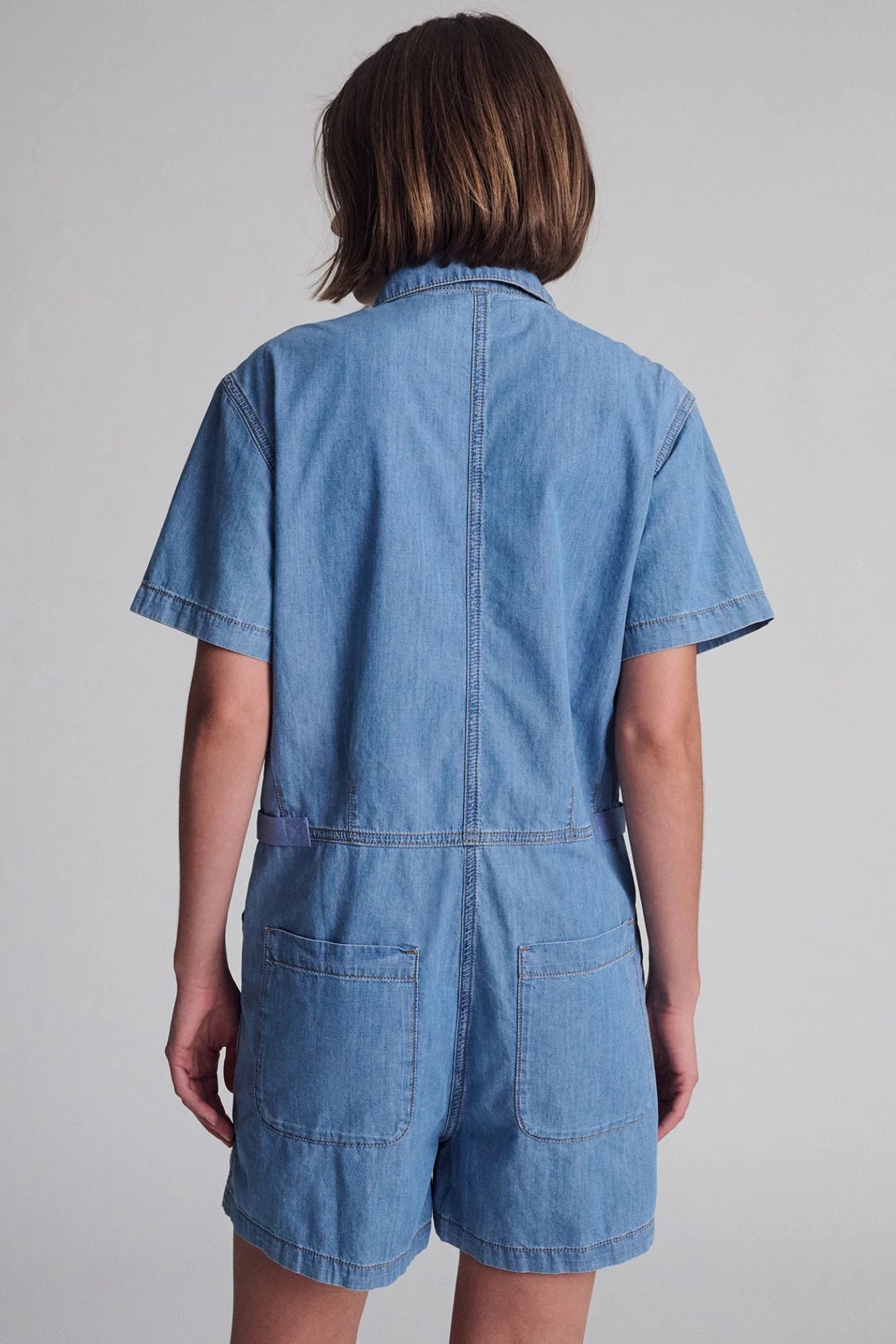 Experience effortless style with the Noreen Denim Romper. This short jumpsuit features a 12" back rise, effortlessly blending comfort and fashion. Perfect for any warm weather occasion, Noreen is the go-to choice for a trendy and versatile look.