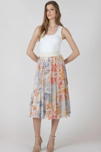 Twirl-worthy elegance meets everyday comfort in this pleated midi skirt. Soft, fluid pleating cascades from waist to hem, creating graceful movement with every step, while a dreamy watercolour floral print adds artistic charm. The midi length flatters all frames, making it perfect for brunch dates, garden parties, or whenever you want to feel effortlessly put-together. A wardrobe essential that dances between feminine and fun.