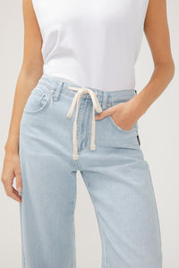 Introducing Silver's Be Easy Drawstring Pant! These on-trend, effortless straight leg jeans feature a comfortable high rise, adjustable drawstring waist, and mid stretch denim for a flattering fit. Perfect for any occasion, they come in a light indigo wash and have 5-pocket styling for a chic, laid-back look. Upgrade your wardrobe with these versatile and stylish pants!