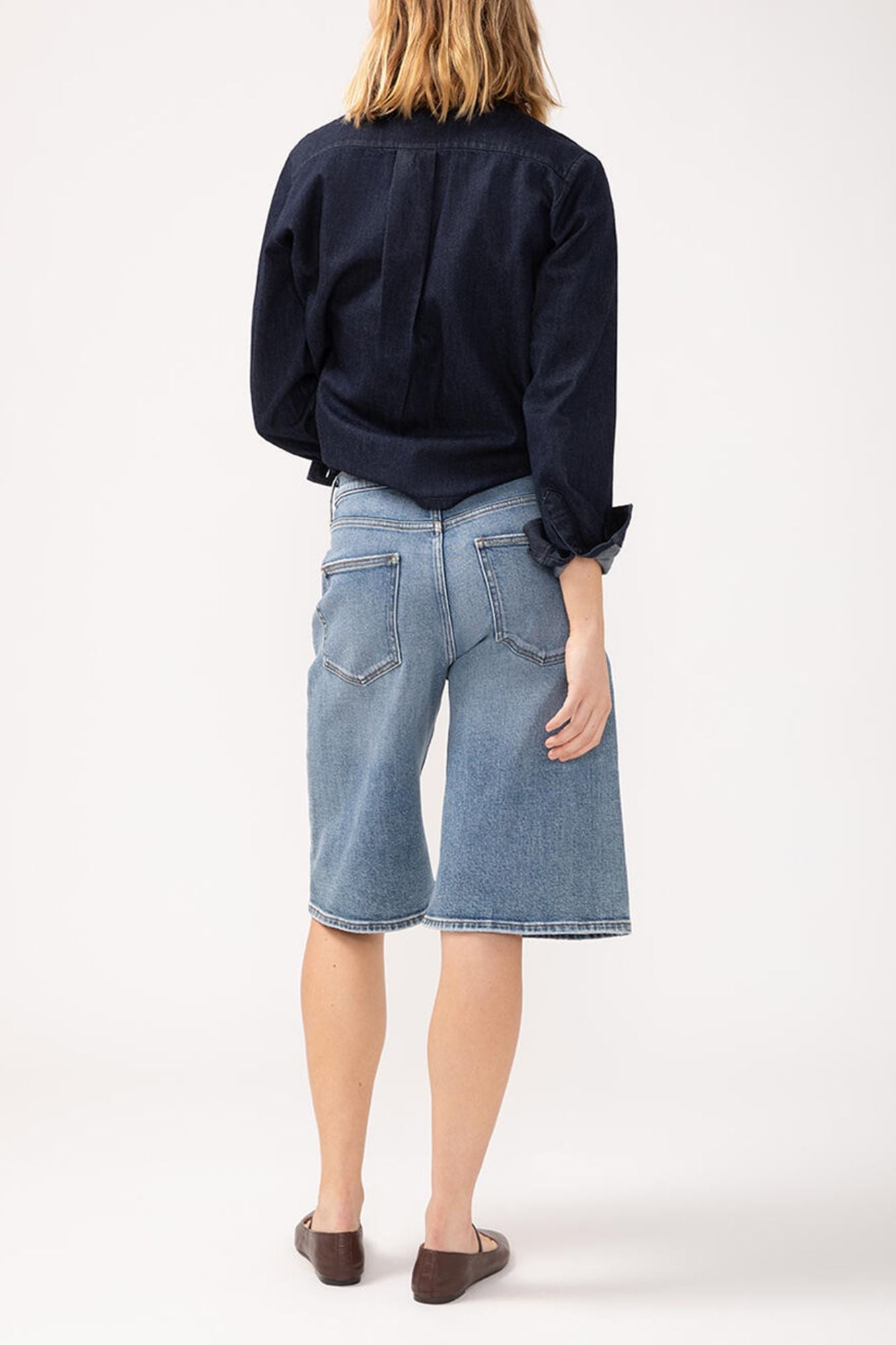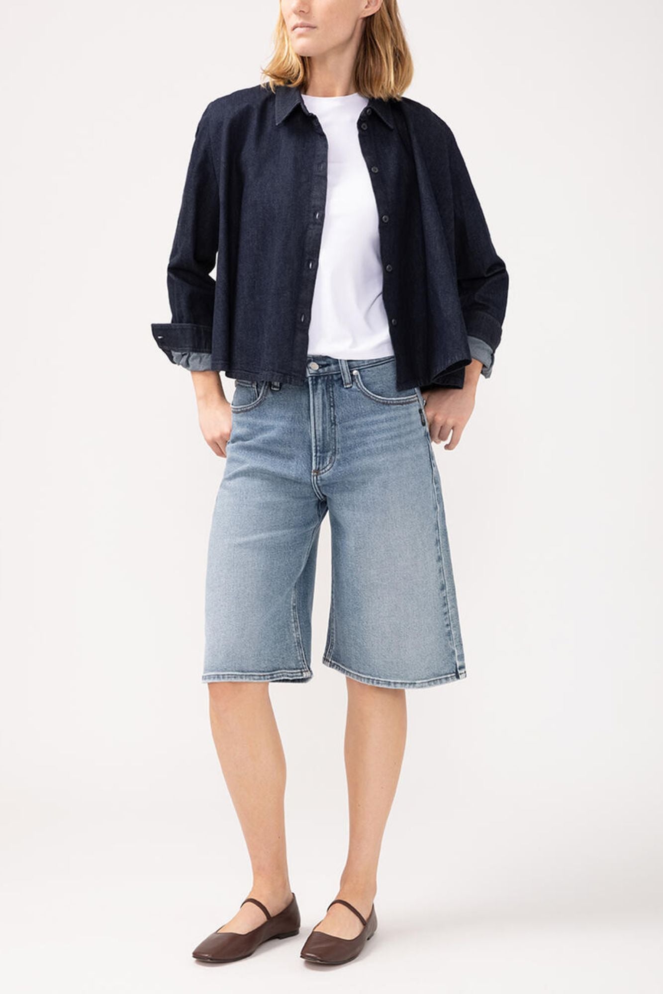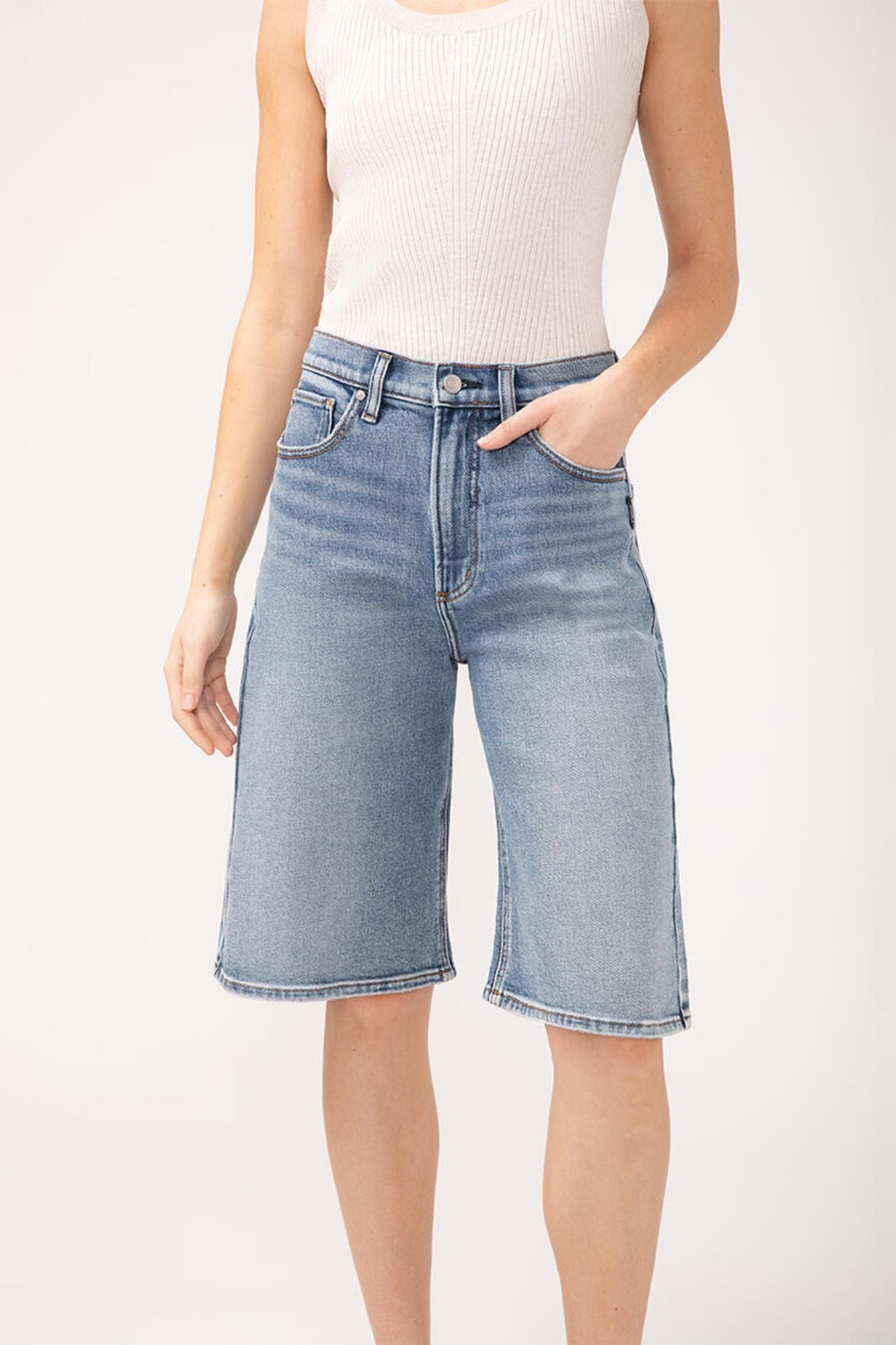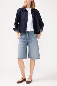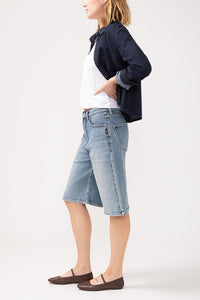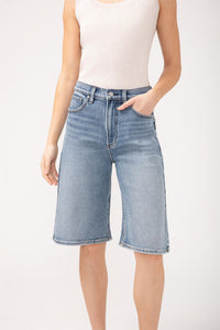 Our Be Easy Long Jorts are the perfect blend of style and comfort. With a trendy high rise and relaxed fit, these shorts effortlessly elevate your warm weather outfits. Made of mid-stretch denim, they provide a comfortable and flattering fit without feeling clingy. Featuring a zip fly and button closure, as well as functional 5-pocket styling. Get ready to feel stylish and at ease with these on-trend long jorts!