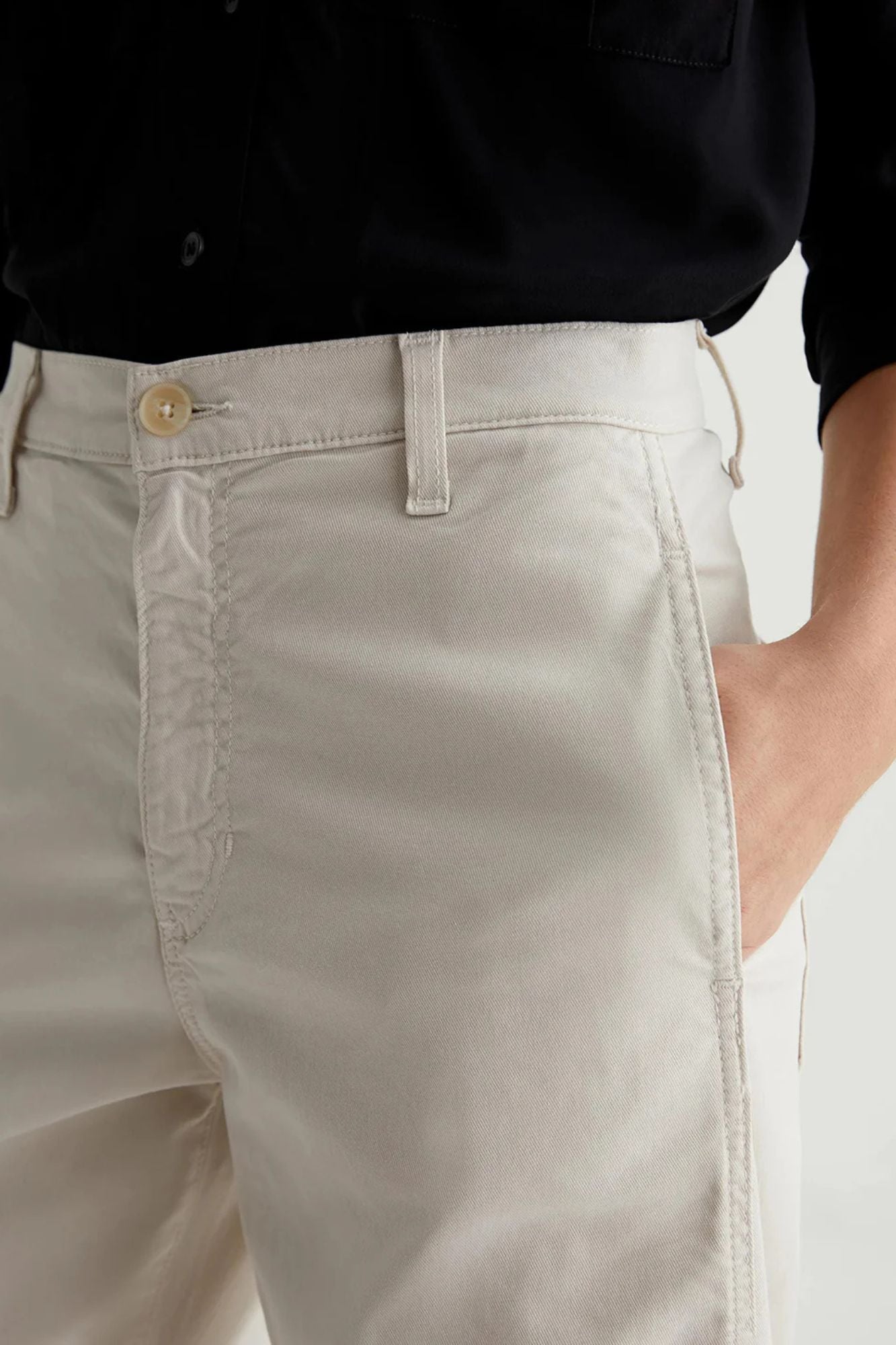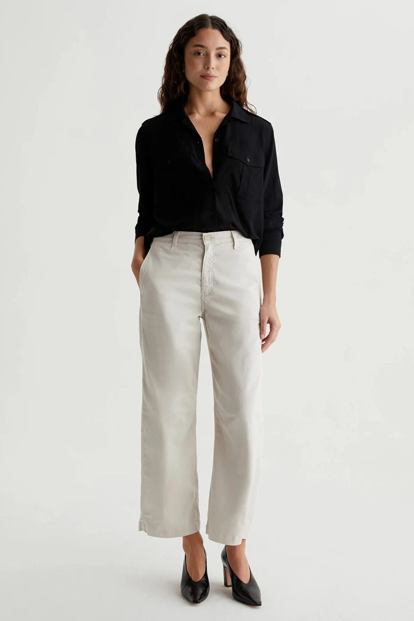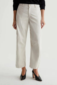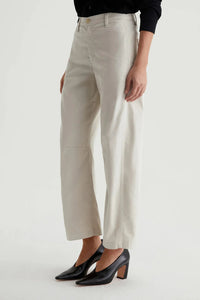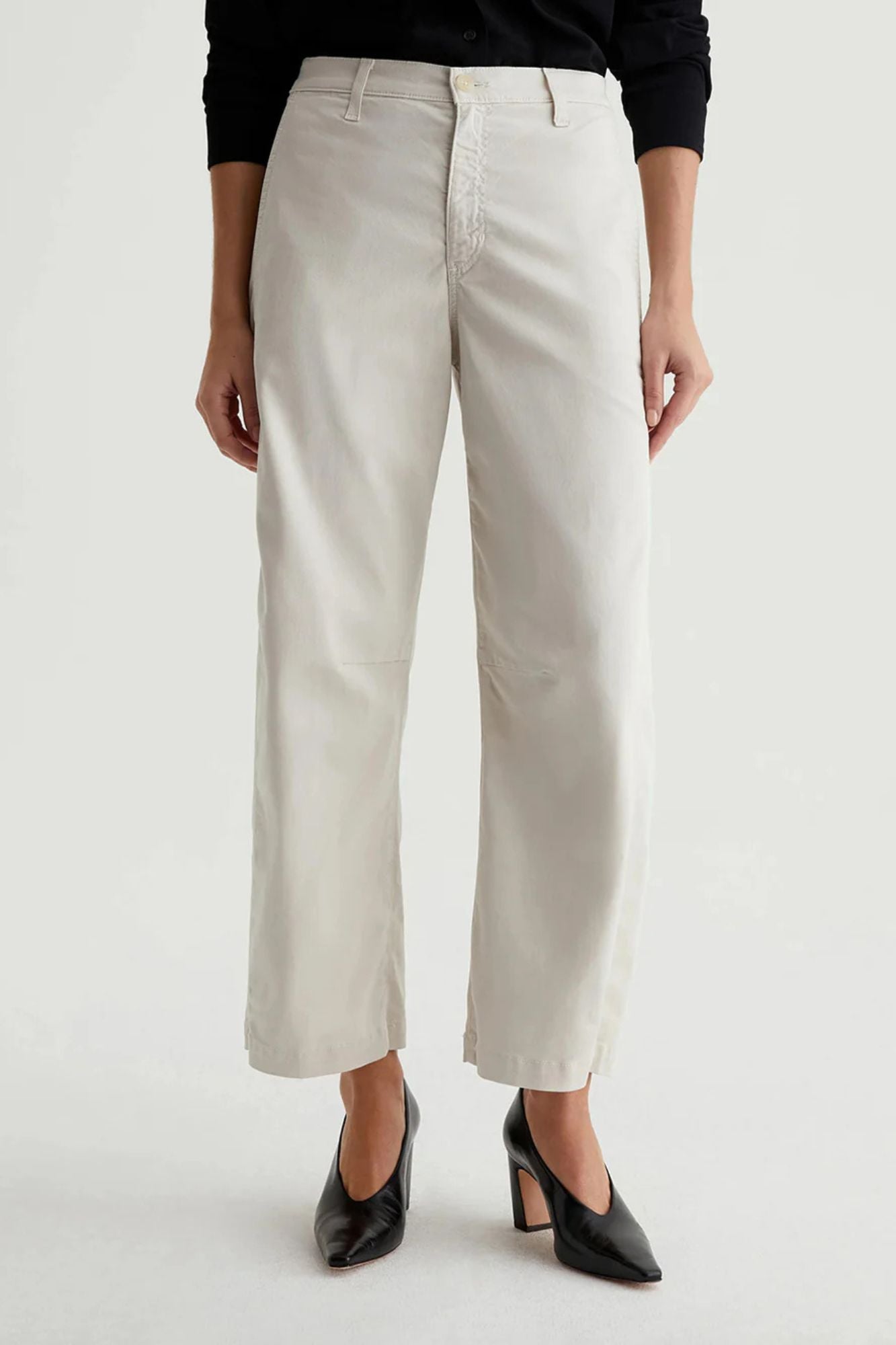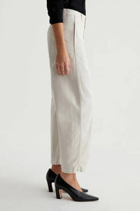Introducing Fiona High Rise Barrel trousers, for high-waisted, ankle-skimming and curve-enhancing style. Made with soft, supple 7.9 oz. Sorrento Stretch Twill from Italy, these off-white chinos feature slant front pockets, curved outer seams, and darting at the inner knees. Elevate your wardrobe and feel luxurious in Fiona.