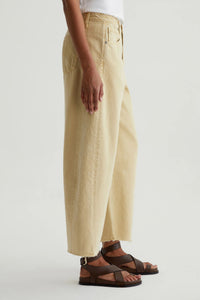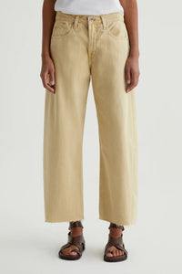 Elevate your denim collection with the Hattie Crop High Rise Barrel jeans. These statement-making pants feature an ultra-high waist and distinctive curved barrel shape with side-seam paneling for a flattering silhouette. The raw hems hit perfectly above the ankle for versatile styling. Meticulously crafted from premium 11.75 oz. Soft Pure Denim in a stunning sulfur-dyed golden yellow, these 100% cotton jeans combine bold style with exceptional comfort.