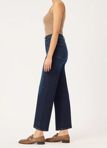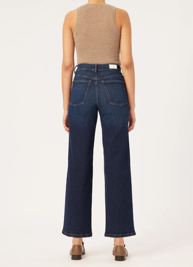 Hepburn is a vintage high-rise that is fitted through the waist and seat, tapering outward from the thigh for a wide leg that hits above the ankle. Mediterranean is a beige tinted, dark indigo wash with subtle fading and whiskering. It features brushed gold hardware, multi-colored stitching, clean hem and a brown back patch.