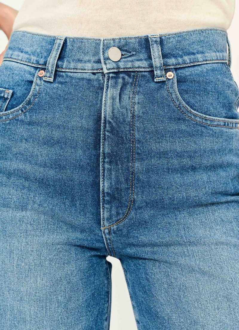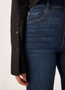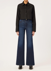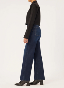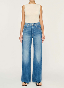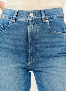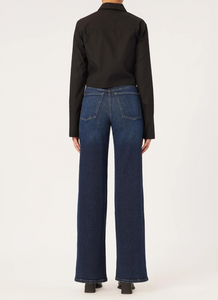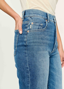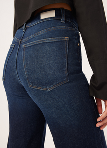 Hepburn is a vintage high-rise that is fitted through the waist and seat, tapering outward from the thigh for a wide leg with a 32" inseam.