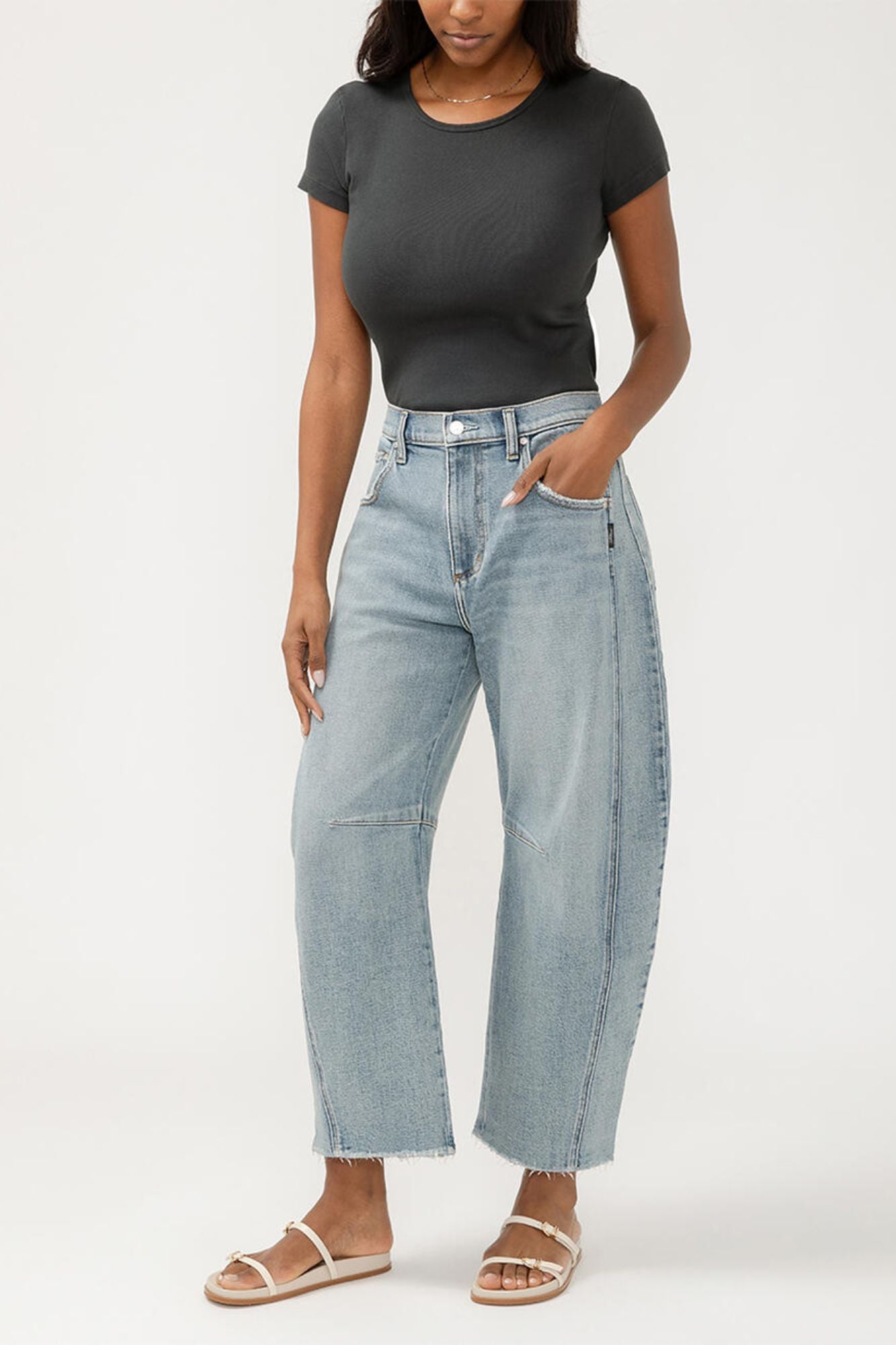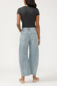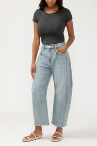 Elevate your casual and elevated looks with our Horseshoe Jeans! Designed with a high rise and tapered leg, these jeans offer a bold, sculpted silhouette. With a modern ankle-grazing inseam and mid stretch denim, they provide both structure and ease for a comfortable fit. Complete with 5-pocket styling, raw hemline, and a 19" leg opening.