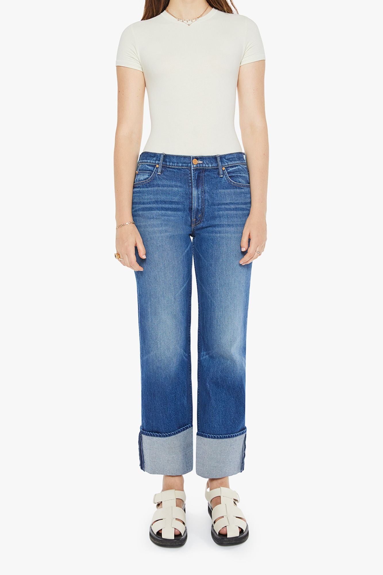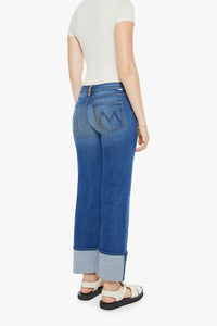 Get ready to roll with the Checkerboard Duster Flood Cuff jeans! These high-rise jeans feature a loose, straight leg and a wide cuffed hem for a stylish and comfortable fit. Made from denim with a touch of stretch, you'll love the mid-blue Bunny Hop color with its whiskering, fading, and funky orange checkerboard-embroidered belt loop in the back.