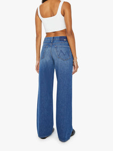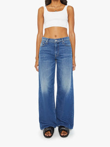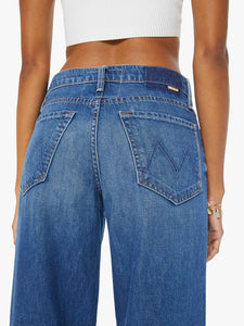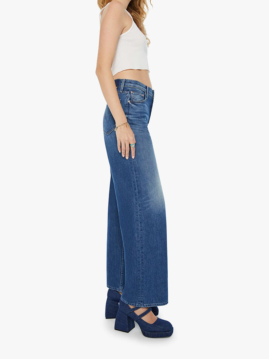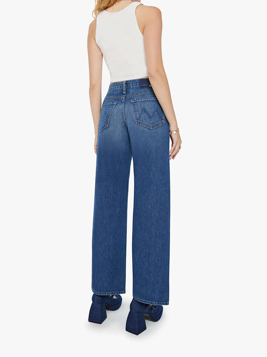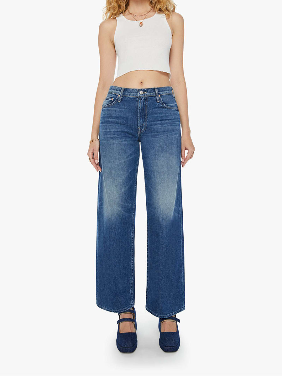 Slouchy, high-waisted jeans with a loose wide leg and a long 32-inch inseam with a clean hem. Made from SUPERIOR 100% cotton, Paint The Town is a dark-blue wash with whiskering and fading at the knee.