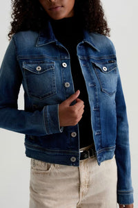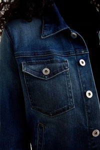 Meet Robyn, the cropped workwear jacket that effortlessly bridges utility and style. Crafted from premium Empower Stretch Denim sourced from Japan's legendary Kaihara Mill, this slim-fit essential moves with you thanks to its responsive fabric. The adjustable waist tabs let you dial in the perfect fit, while strategically placed chest flap and welt front pockets keep your essentials secure. Finished in our signature 9 Years Enchantment medium blue wash—engineered to capture the authentic fading and texture of well-loved denim—Robyn arrives ready to become your go-to layer. Debossed metal buttons and a logo detail on the chest flap add understated sophistication. Versatile enough for the office, the studio, or the street.
