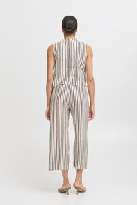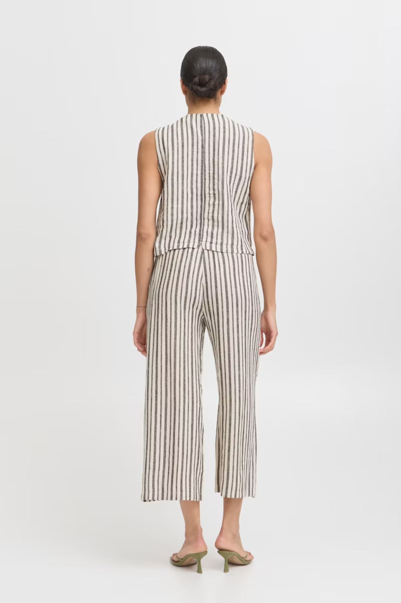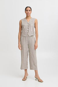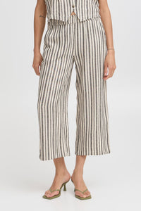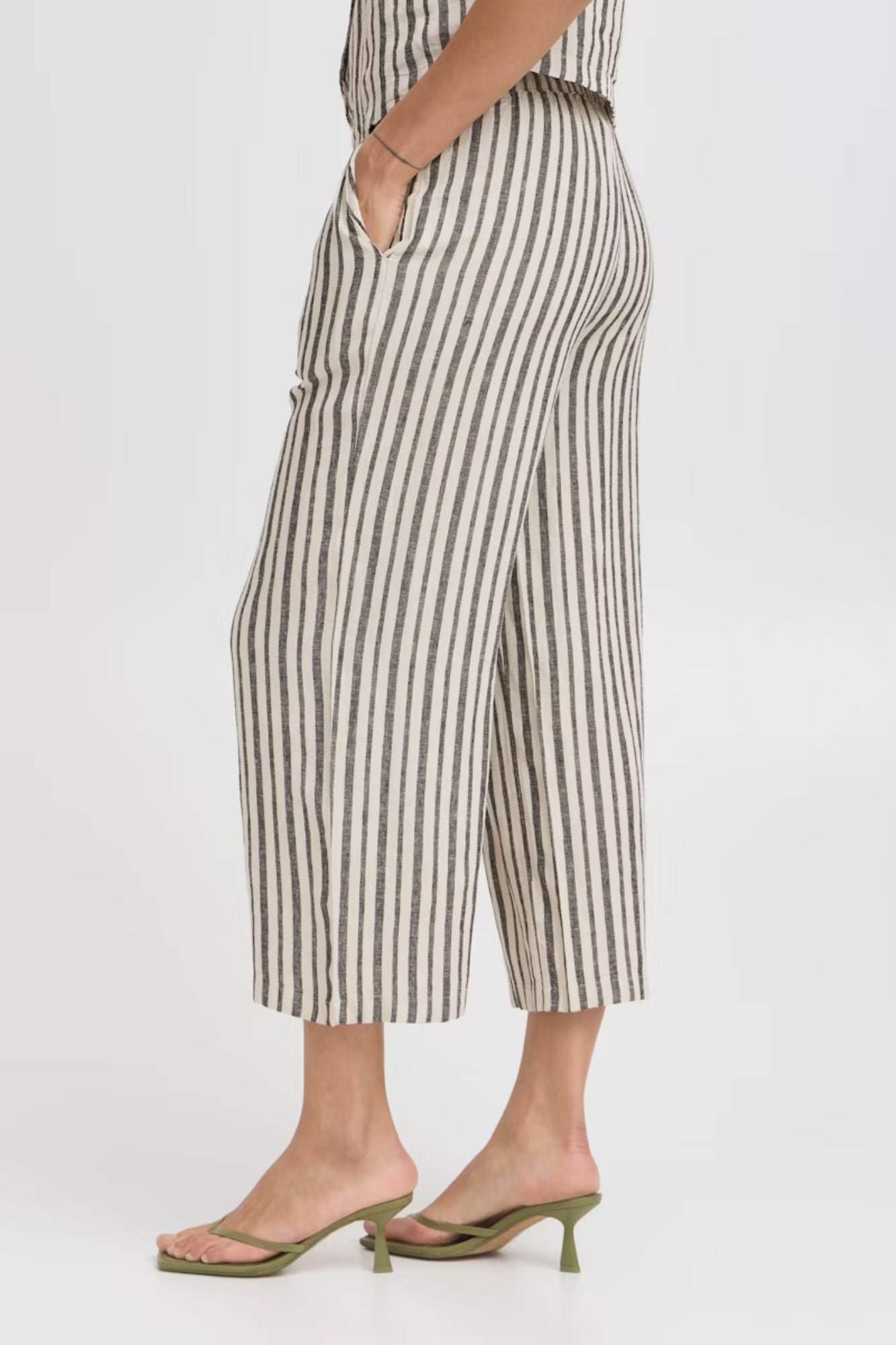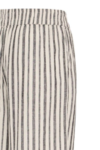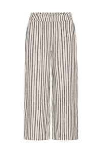 Elevate your summer wardrobe with the Falakka Crop Pants. These stylish wide-leg cropped pants feature an eye-catching striped pattern that commands attention. Crafted from a premium linen-viscose blend, they offer the perfect balance of breathability and drape for all-day comfort. The convenient elastic waistband ensures a flattering fit while allowing effortless movement. Perfect for both casual outings and dressier occasions.