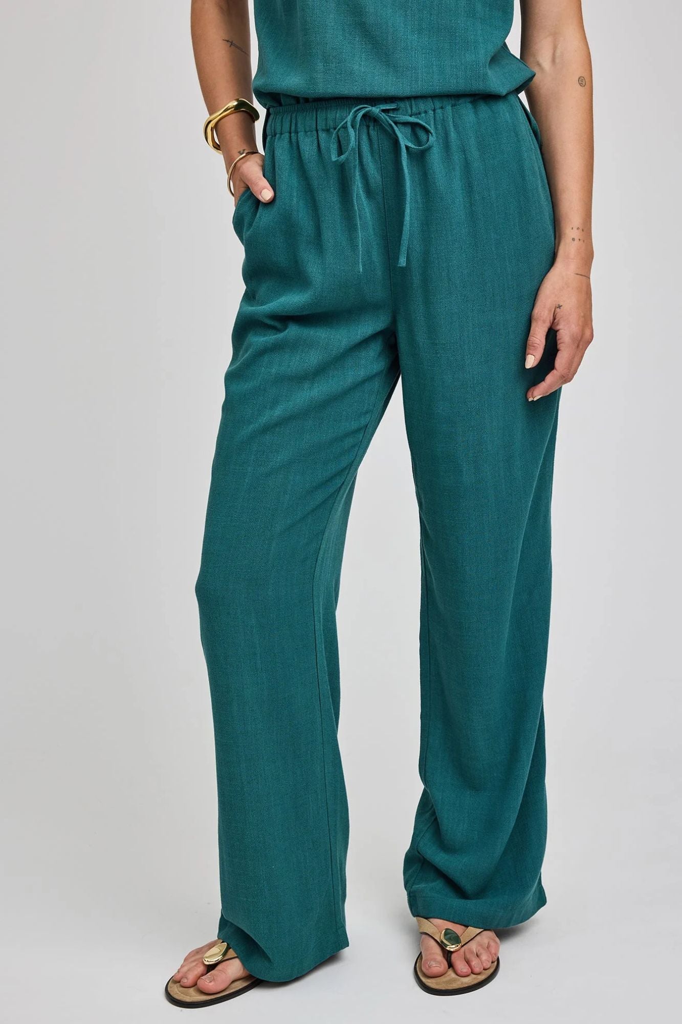Crafted from a breathable linen blend, the Finley pant delivers an effortless, relaxed silhouette perfect for warm-weather styling. Functional slash pockets keep essentials close, while the elasticated waistband with adjustable drawcord ensures a custom fit all day long. Pair with the Vera tank or Portia button-down for an easy, coordinated look.