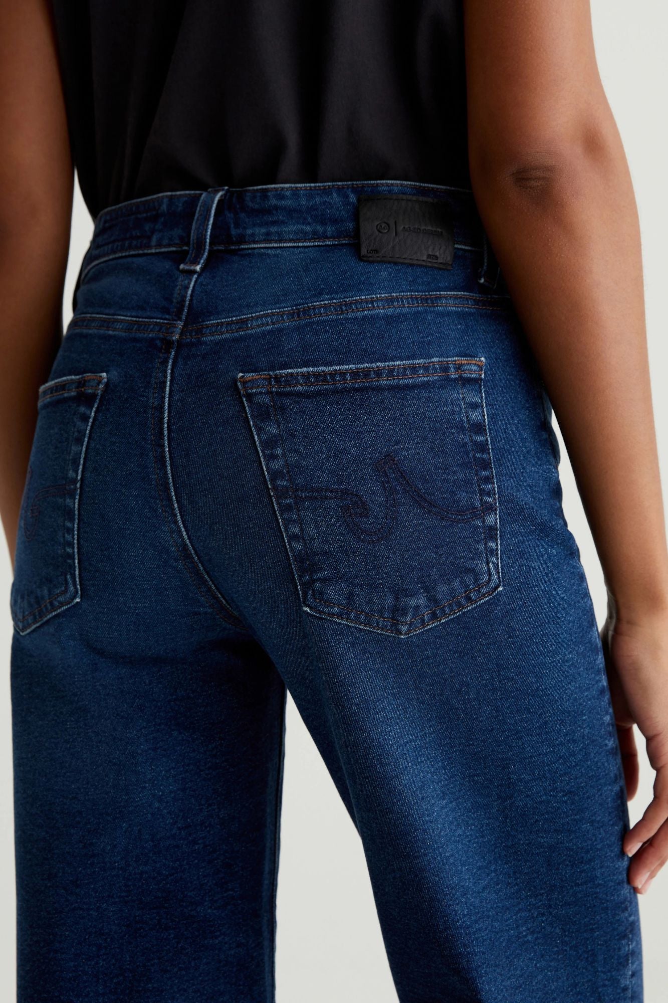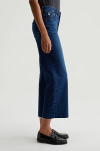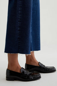 Get ready to make a statement with the Saige Wide Leg Crop jeans. With a mid-rise waist and loose, cropped legs, these jeans offer a comfortable and stylish fit. Made with high-quality Italian denim, the AG-ed dark blue wash, fading, and whiskering create an edgy look. Perfectly finished with marigold stitching and raw hems, these jeans are the ultimate must-have for any fashion-forward individual.