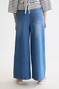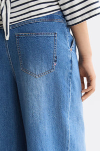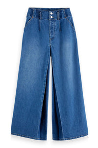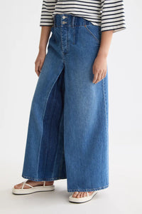 These dramatic wide-leg jeans feature a high-rise, wide waistband and front pleats mixing vintage inspiration with modern volume.