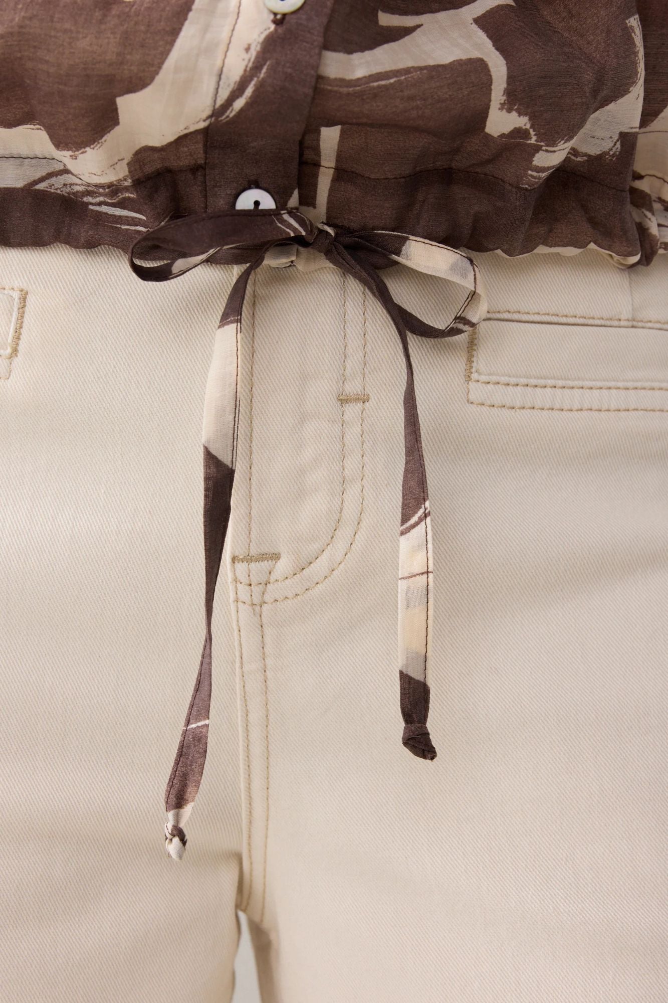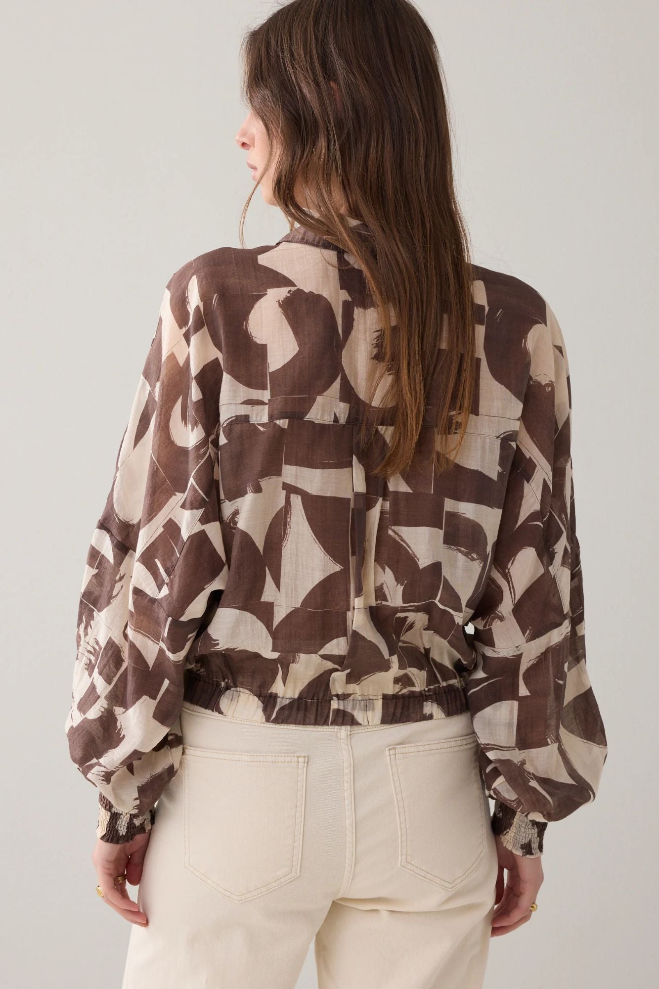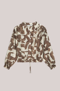 Effortlessly chic and undeniably flirty, this boxy blouse plays with proportion and texture in all the right ways. The slightly sheer fabric showcases a captivating graphic print, while mother-of-pearl buttons add a touch of understated elegance. Lowered shoulders with gathered panels create a relaxed, modern silhouette that feels both intentional and carefree. Smocked sleeve cuffs and a drawstring hem with elastic back detail deliver subtle movement and a whisper of flow—perfect for those moments when you want to look put-together without trying too hard. A versatile piece that transitions seamlessly from day to night.