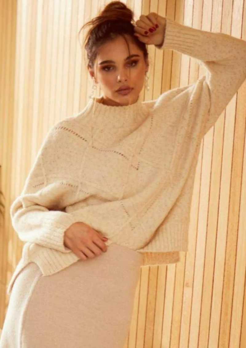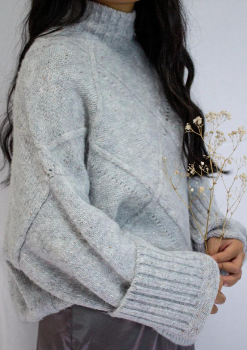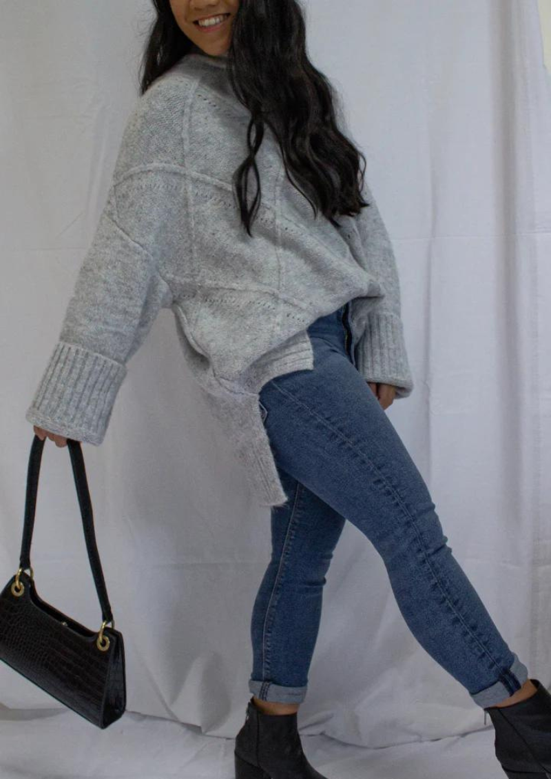Snuggle Up with The Helsinki for sweater weather. This stone cozy turtleneck sweater with ribbed trim detailed long sleeves is a must-have piece for autumn and winter! Complete this look with patterned charcoal clutch bag and leather black booties.