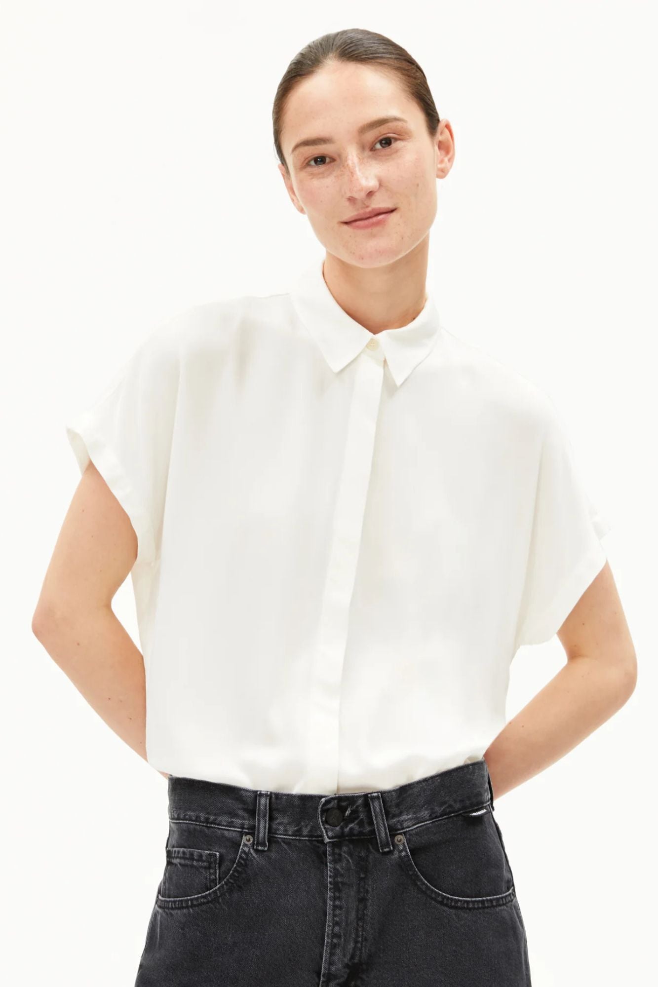 The Larisaana Blouse features a relaxed fit with short sleeves and a classic shirt collar, making it perfect for effortless style and comfort. Crafted from 100% viscose, it feels soft and breathable on the skin. The button placket is detailed with eco-friendly Corozo buttons, adding a touch of natural elegance to your wardrobe.