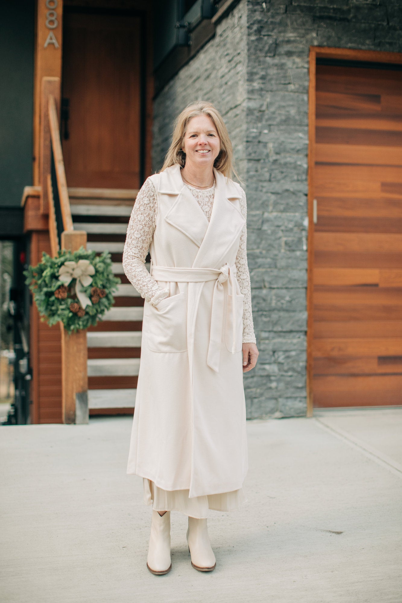 A chic, minimalist layer in a soft cream tone, this long belted vest features clean lapels, deep patch pockets, and a beautiful drape. It slips easily over lace, knits, or tees for an elegant, understated finish.