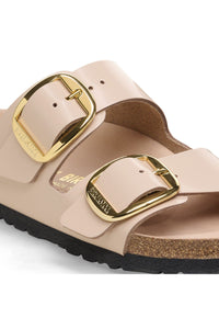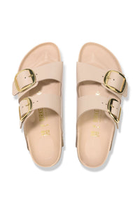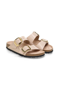 The legendary two-strap design from BIRKENSTOCK with amplified buckle accent - the Arizona Big Buckle. The Big Buckle version features a large, elegant buckle creating a bold yet minimalist design. The semi-exquisite footbed is fully lined with soft piumato leather, making it exceptionally comfortable. The upper is made from high-quality natural leather with a high shine finish.