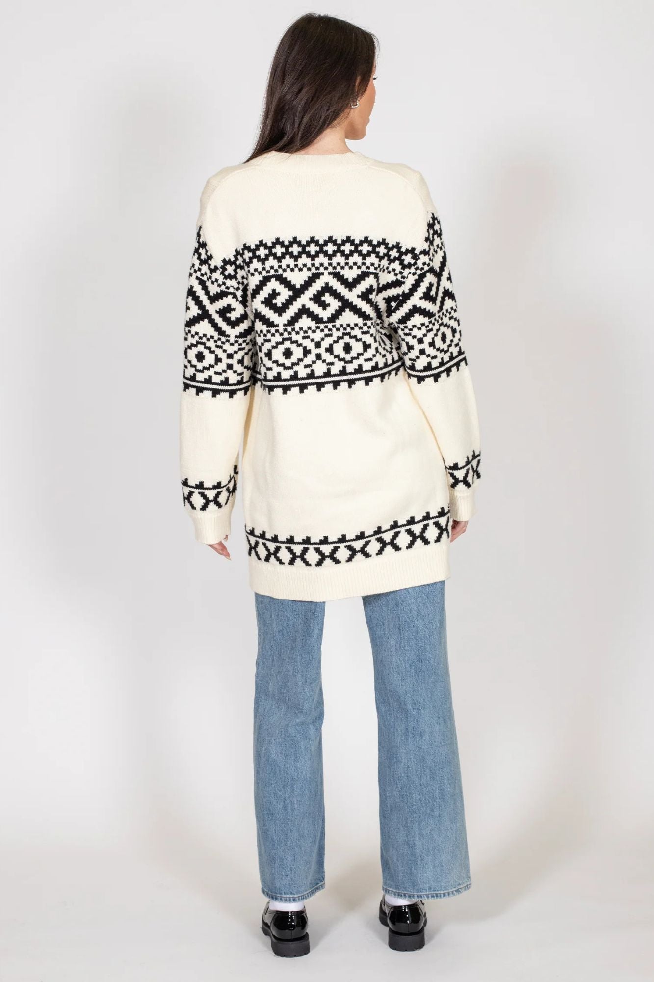 Cozy up in style with our iconic Fair Isle Cardigan. This oversized v-neck sweater features dropped shoulders, a ribbed hem, and vintage-inspired tortoise buttons. Made for ultimate comfort and style, with the option to size down for a relaxed fit.