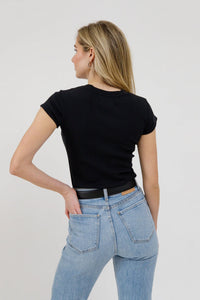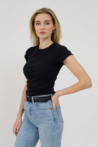 The Ribbed Fitted Tee is your new go-to for effortless style. This sleek piece features a fitted silhouette that skims your body and lands right at your hips for a flattering finish. Crafted from a soft cotton blend with just enough spandex mixed in, it moves with you while keeping its shape. The subtle ribbed texture adds visual interest without the fuss. Wear it solo or layer it under your favorite jacket—either way, you'll feel comfortable and put-together. Stick with your true size for the perfect fit.