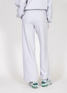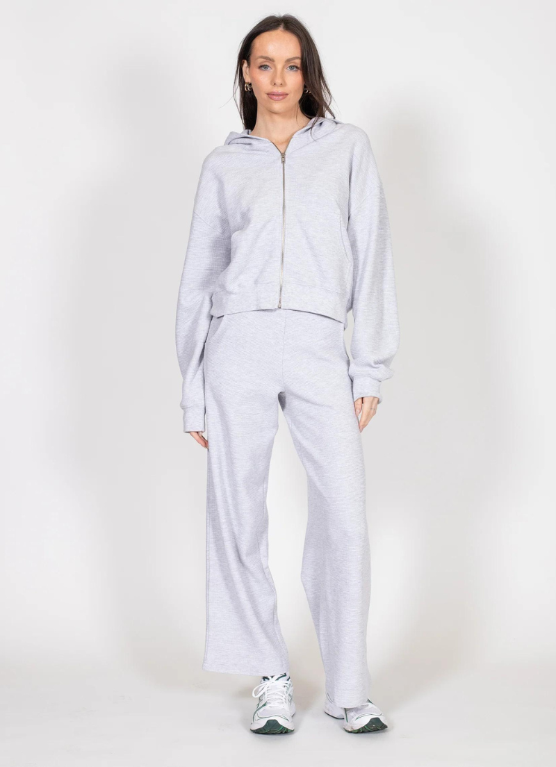 The Waffle Knit Wide Leg Pant in Biscotti is a high-rise, wide-leg pant with a 30" inseam. Biscotti is a heathered grey with a touch of oatmeal.
