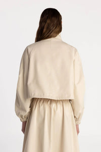 The Tindra Jacket combines soft structure with modern versatility. Crafted from smooth woven twill and fully lined for comfort, this loose-fit silhouette features a high neckline and concealed front placket with zipper and snap closures for a clean finish. Front flap pockets with snap fastening add utility detail, while elbow pleating enhances movement and shape. An adjustable hem with elastic loops and toggles allows you to customize the silhouette. Lightweight yet structured, The Tindra Jacket is an effortless layering piece for work or casual wear.
