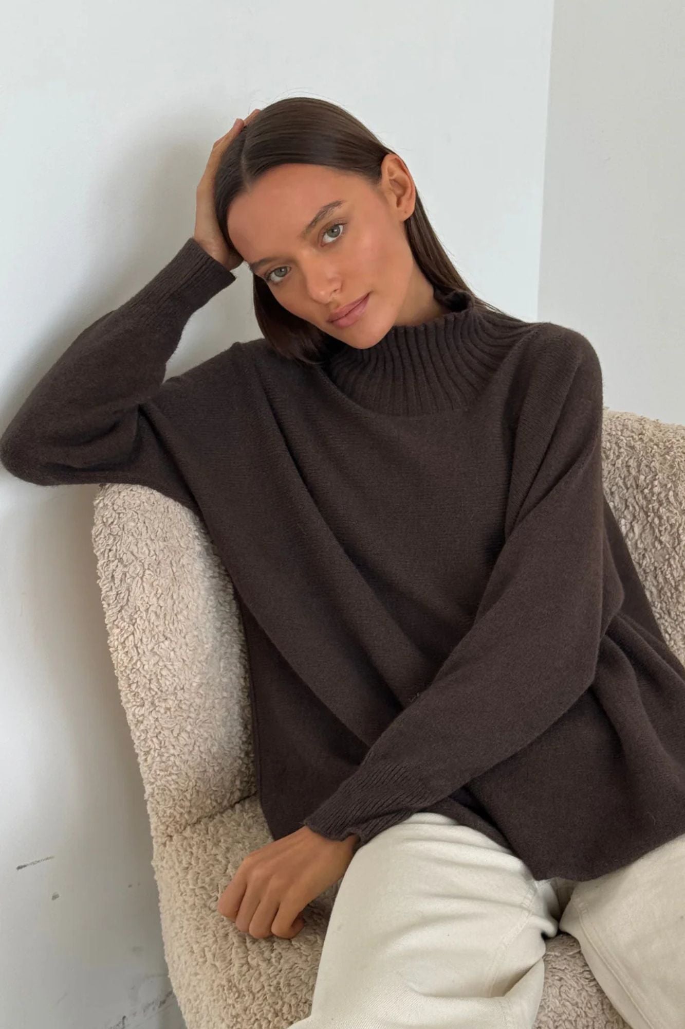 The Alma Sweater is your go-to piece for effortless sophistication. This relaxed-fit design delivers that coveted slouchy silhouette while the refined mock-neck in ribbed knit adds an unexpected touch of elegance. Perfect for layering or wearing solo, it transitions seamlessly from weekend errands to casual dinners out. The Dark Espresso shade offers versatile styling potential with virtually any wardrobe staple. Comfortable enough for everyday wear yet polished enough to elevate your most laid-back looks.