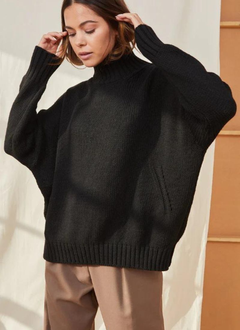 Margot is a fashion forward mock neck knitted wider with pointelle detailing and a fashion forward silhouette. Easy side split and contrasting rib trim. Narrow sleeves make it easy to slip your favorite tailored coat on top for an effortlessly chic day look.