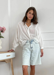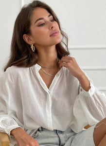 Romantic soft cotton voile blouse with mandarin collar is an easy way to elevate your off duty look. Relaxed fit with balloon sleeves makes a great styling foundation piece that can be teamed with denim or higher waisted trousers. Pearl buttons give a luxe feel to a versatile wardrobe classic.