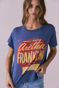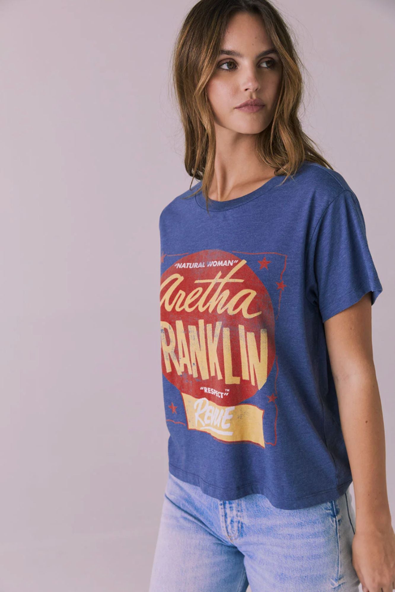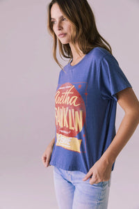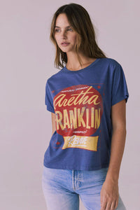 Celebrate the Queen of Soul with the Aretha Franklin Respect tee, featuring a hand-painted vintage font in a cool Honest Indigo shade. This recycled vintage jersey crewneck offers a soft, worn-in feel and a ribbed neckband for added comfort. Perfect for those who want to rock timeless style while honoring a true music legend.