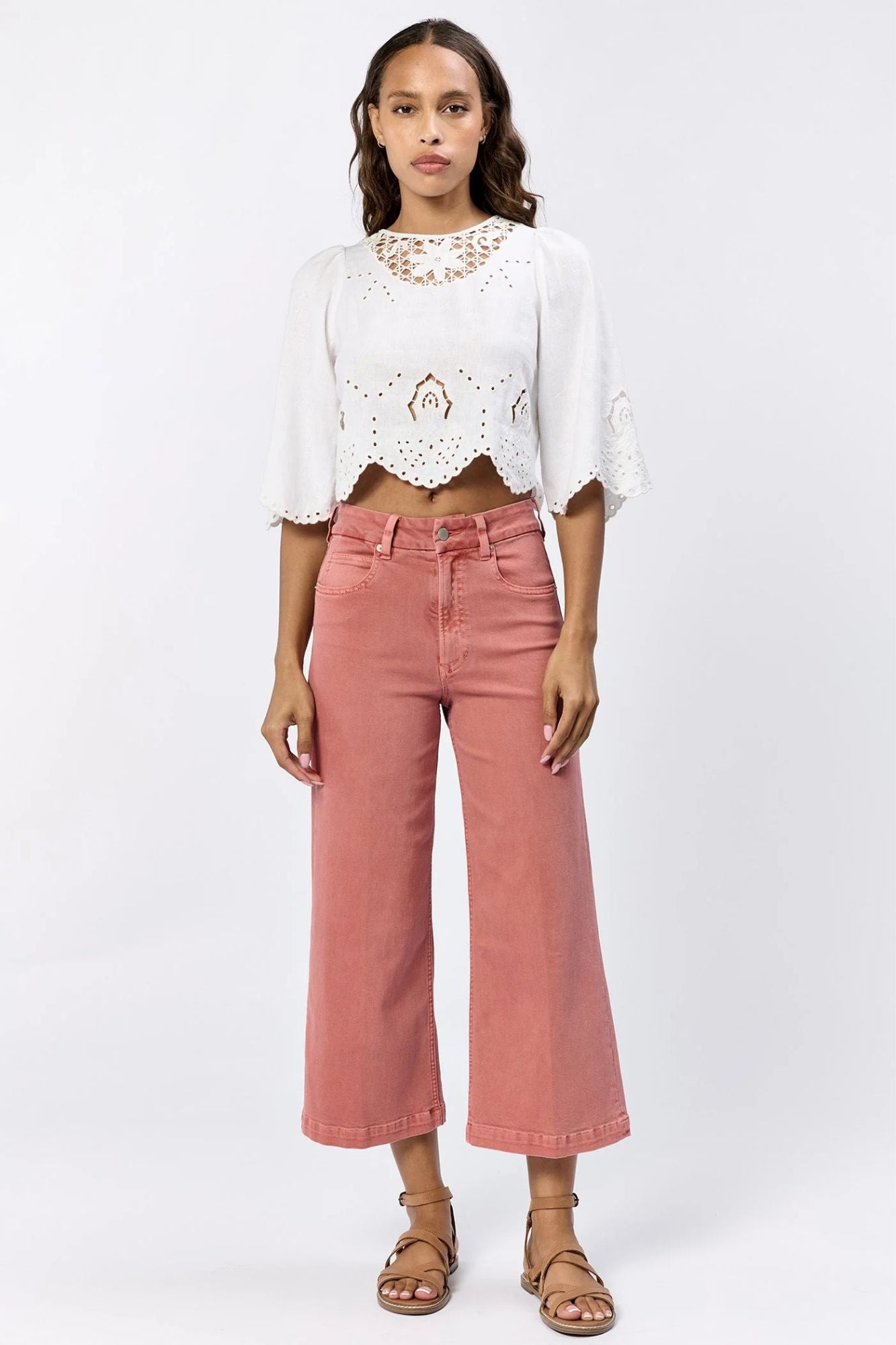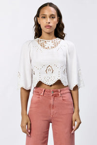 The Blythe Novelty Top Embroidery brings a playful twist to your wardrobe with its charming embroidered bodice and delicate lace neck featuring a back keyhole and ties. Its breezy linen-cotton blend keeps you comfy while the cropped fit and 3/4 sleeves add a flirty flair. Perfect for mixing and matching, this top effortlessly lifts any outfit from casual to chic in a snap!