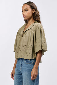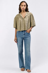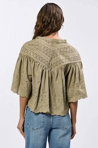 The Elodia Top, crafted from delicate embroidery poplin cotton, combines elegance with a modern edge. Its button-up henley design offers a tailored, sophisticated look, while the cropped fit adds a trendy twist. Perfect for versatile outfits, this breathable top effortlessly transitions from day to night, making it an essential addition to any stylish wardrobe.