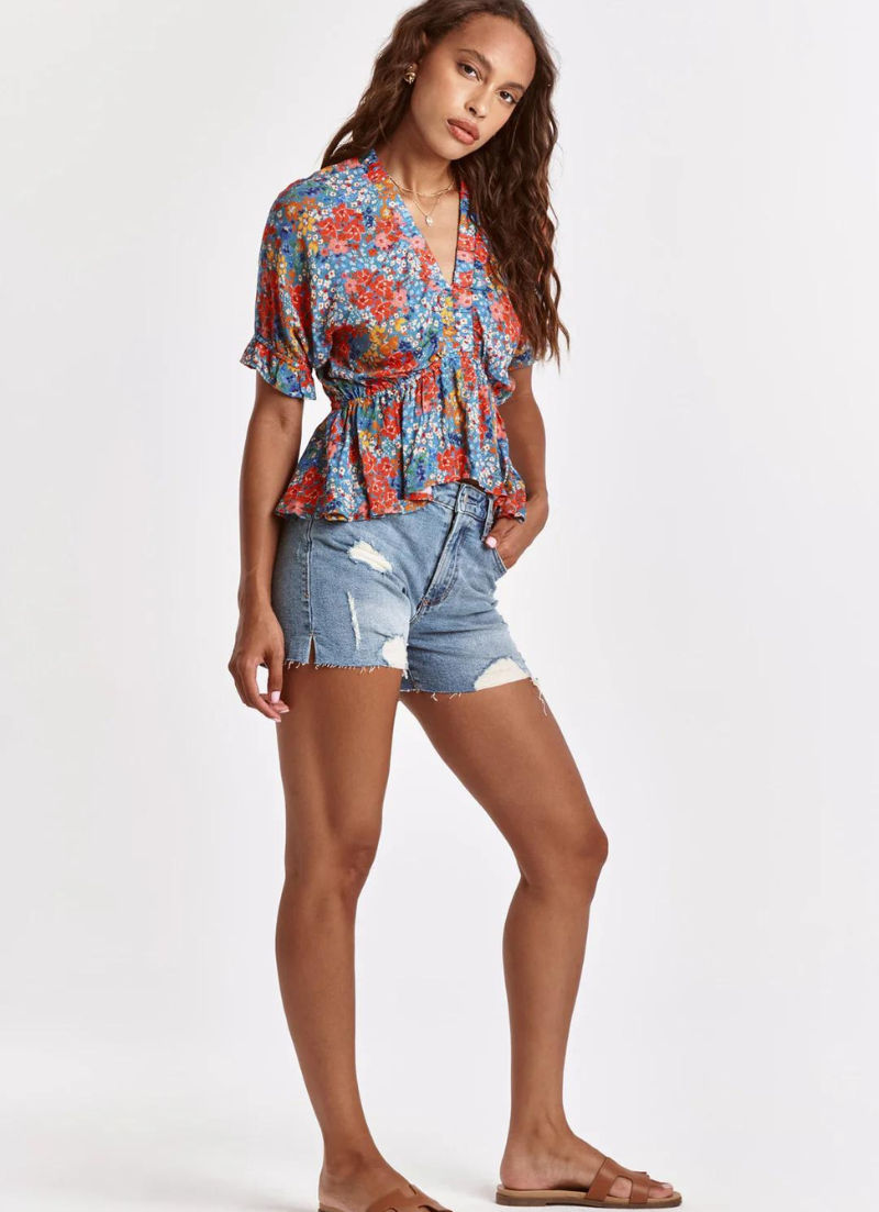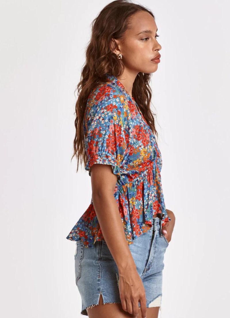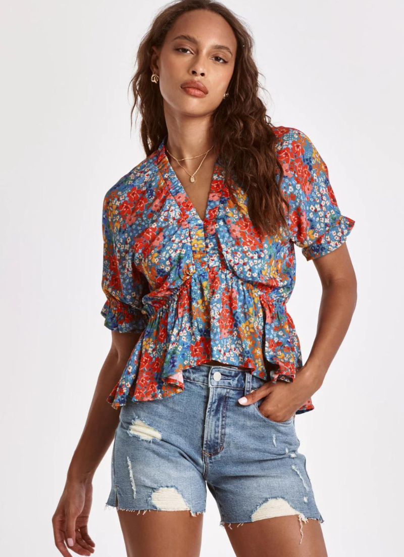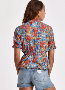 Elastic waist peplum top, banded v-neck & front placket, raglan short sleeve with elastic cuff in floral statement. Multi print woven on relaxed fit. Immerse in the allure of vibrant tropical blossoming of your bold elegance and charm!