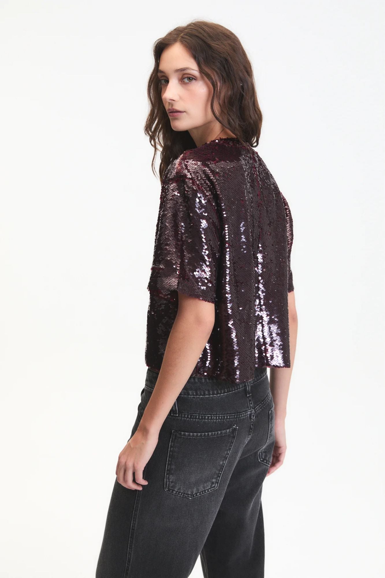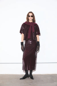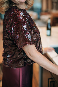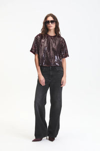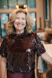 Sparkle and shine in the Logan Top, a playful sequin number that's equal parts fun and fabulous. This boxy, cropped beauty features a classic round neckline and short sleeves for effortless style. The back slit with button closure adds an unexpected twist—literally. Fully lined for comfort and confidence, the relaxed fit keeps things cool and casual. Perfect for nights out or whenever you want to catch the light and turn heads.