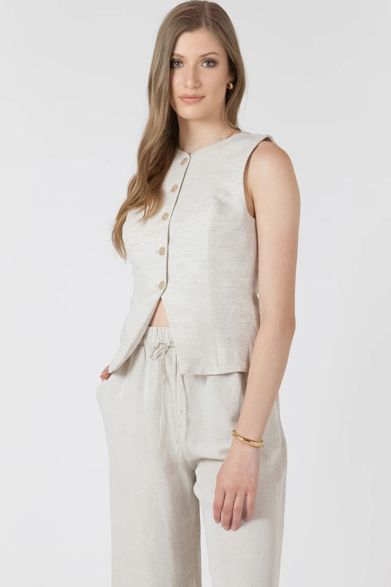 A refined button-up vest that transitions seamlessly from standalone statement piece to layered essential. Crafted with a lightweight, streamlined design, it moves fluidly with your body for both casual outings and sophisticated layering. Wear it solo for understated elegance or drape it over your favorite blazer for added dimension. Pair with matching trousers to create a polished, coordinated ensemble that effortlessly bridges seasons and occasions.