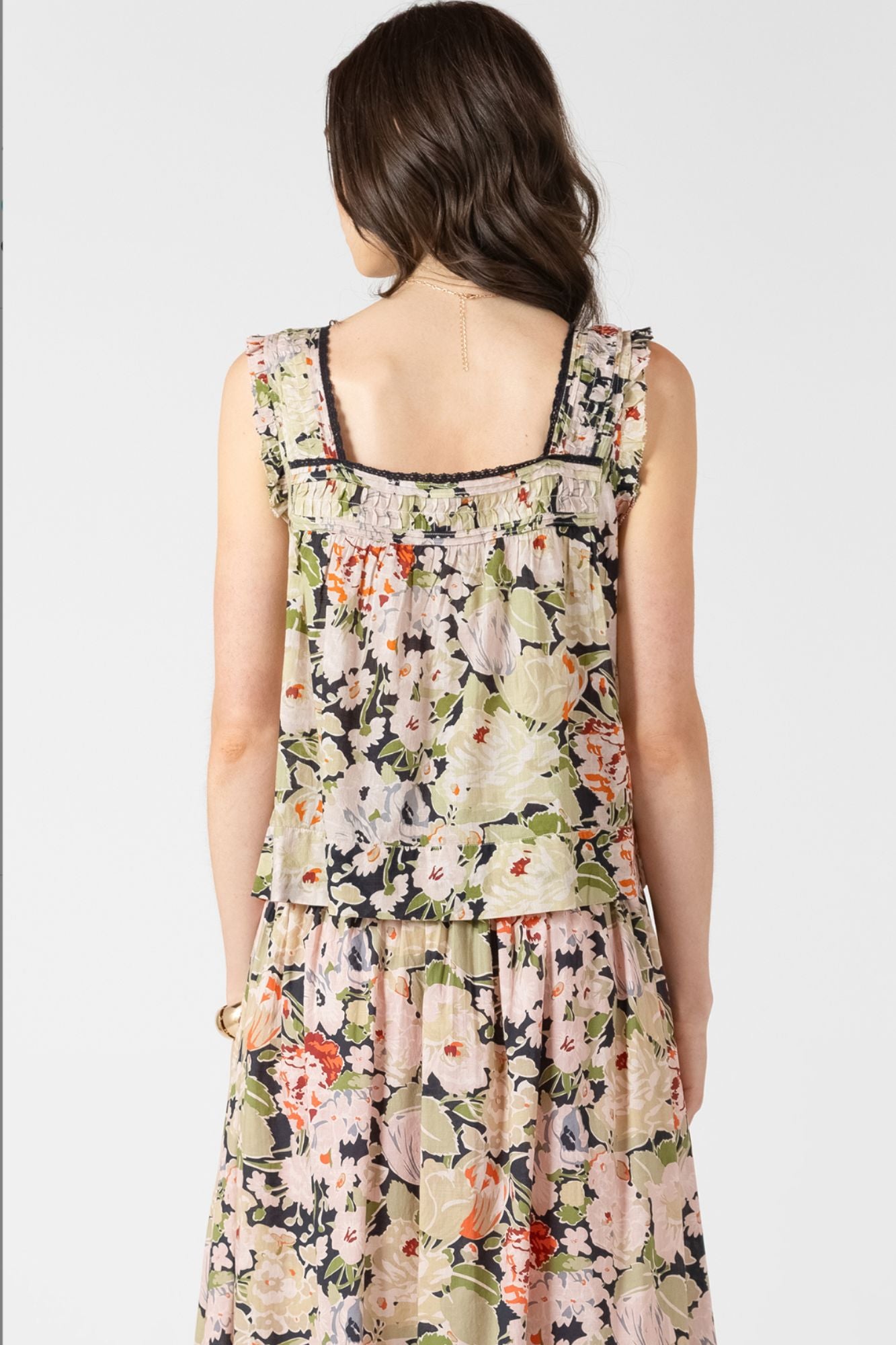 Airy floral tank crafted for balmy-weather wear. Showcases elegant lace detailing on the chest and shoulder straps for a refined aesthetic. Ideal for spring walks and summer getaways, this light, breathable garment delivers relaxed sophistication and comfort.