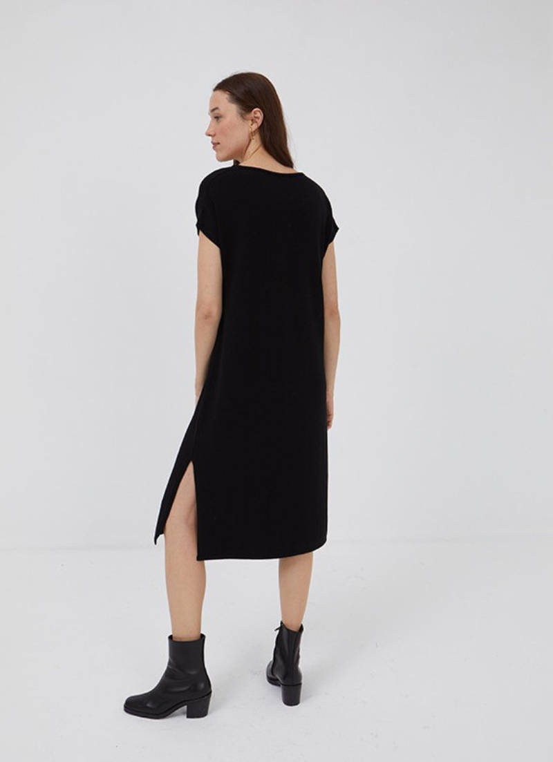 Comfortable and stylish, the Maguilla dress has a V-neckline, dropped shoulders and side slits. The model is wearing size S.