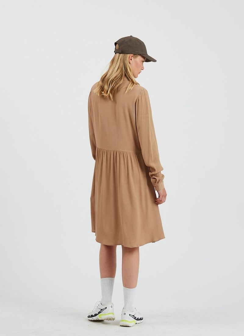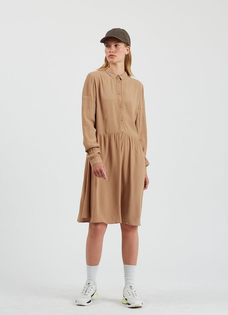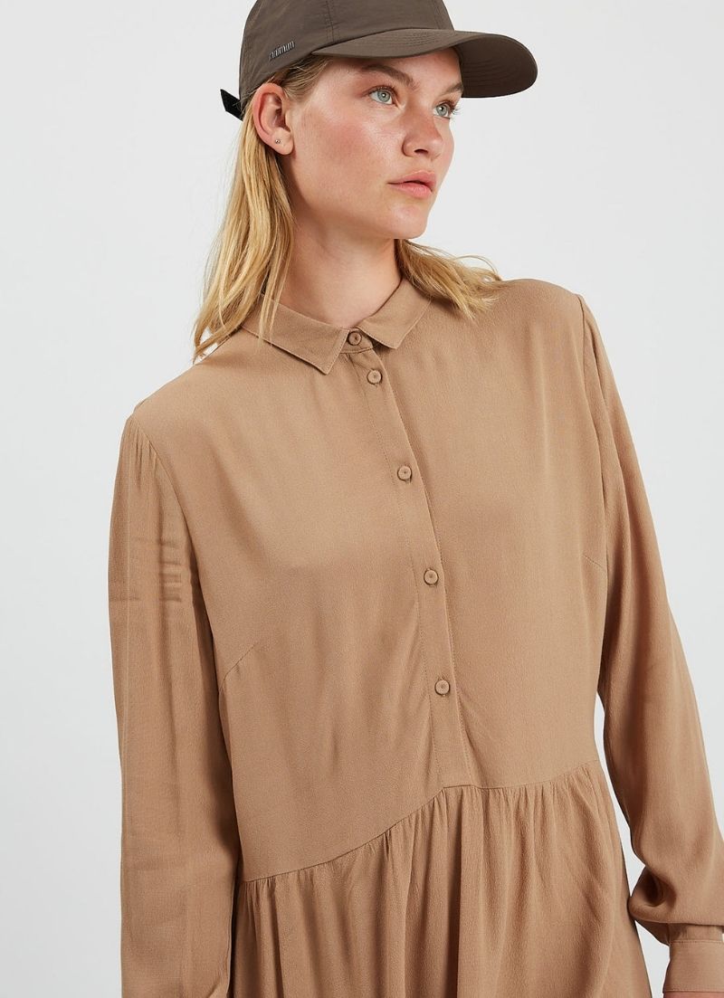 Bindie is a loose dress designed with an above knee length, pleats around the waist and is detailed with a shirt collar, half placket, and upholstered buttons.