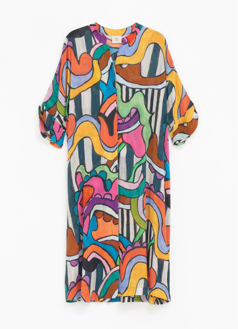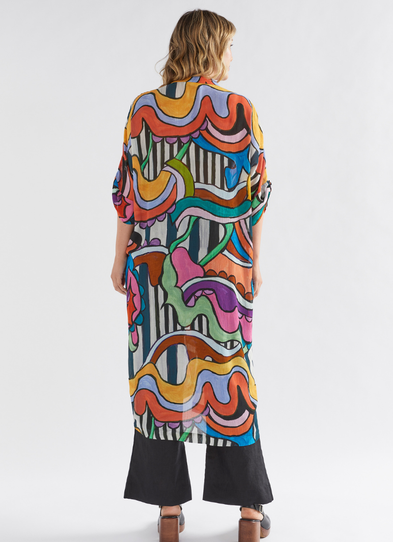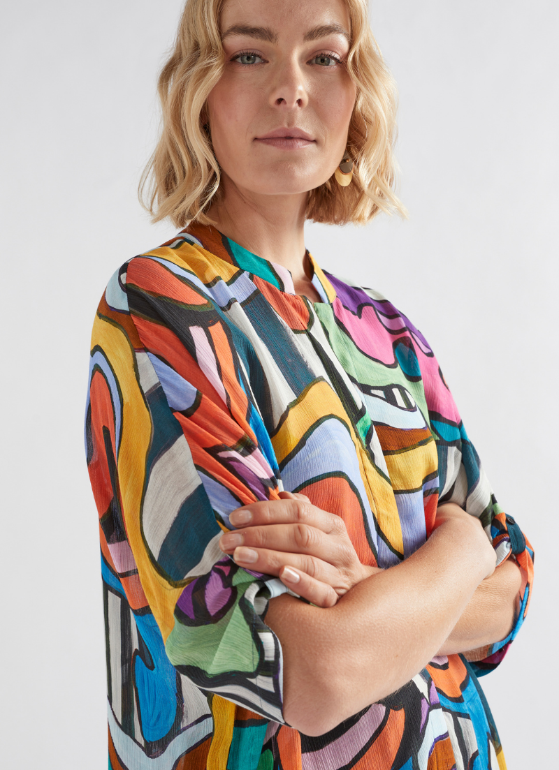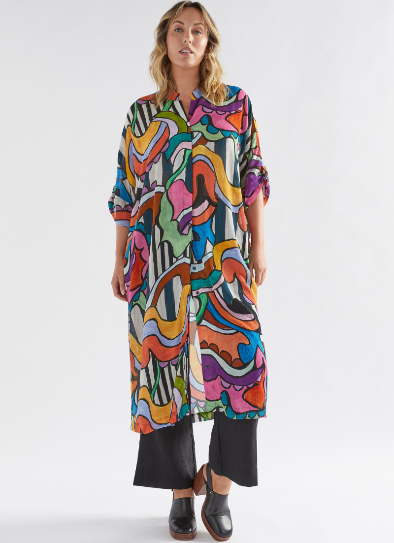 The Soma Shirt Dress is a midi length collarless shirt dress in a slightly sheer fabric. With a concealed button placket and a batwing sleeve, the dress also has a soft, wide sleeve cuff with a single button tab. The fabric has a crinkled texture effect, and floats over the body with a soft drape.