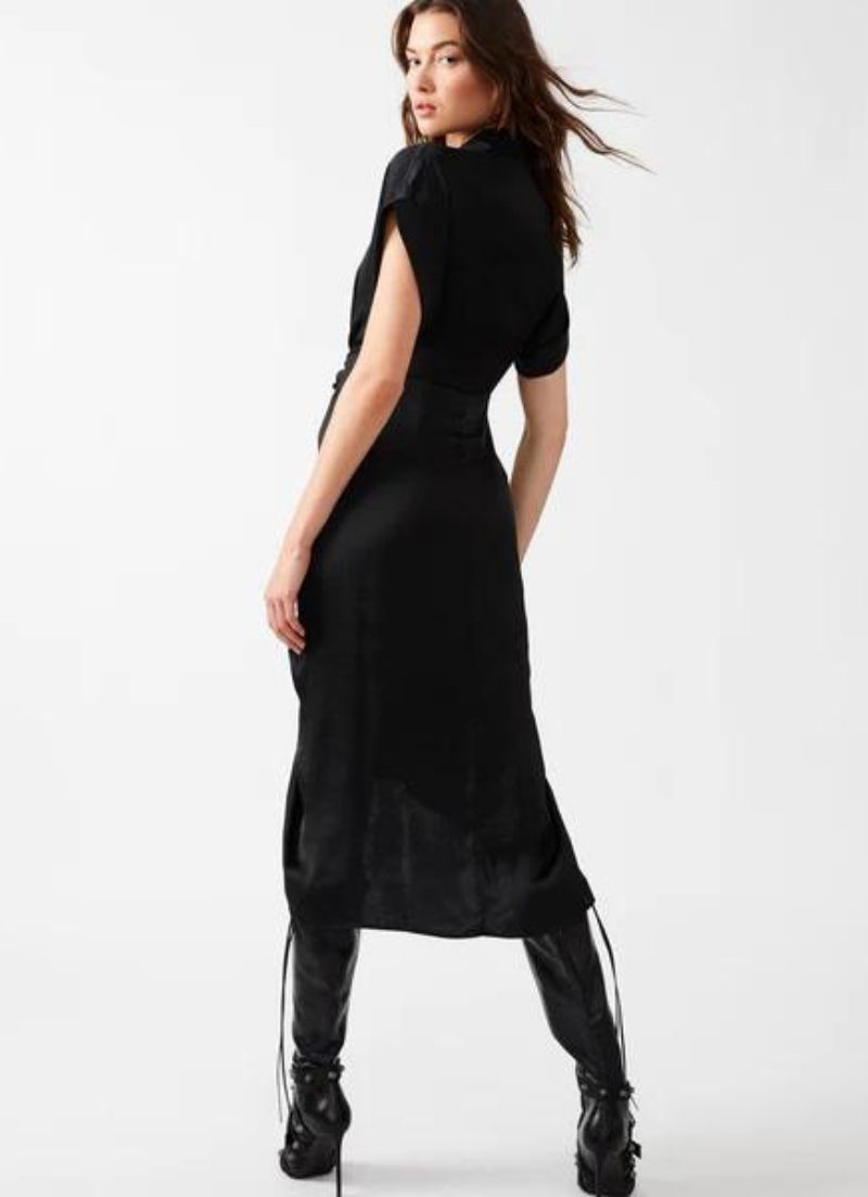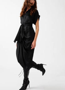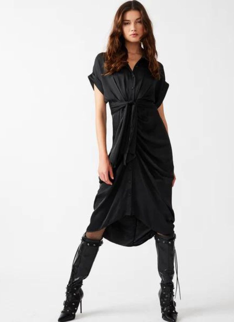 The Tori dress features tailored details like a collared neck and rolled sleeves, finished with a gathered front for a high-low hem effect.