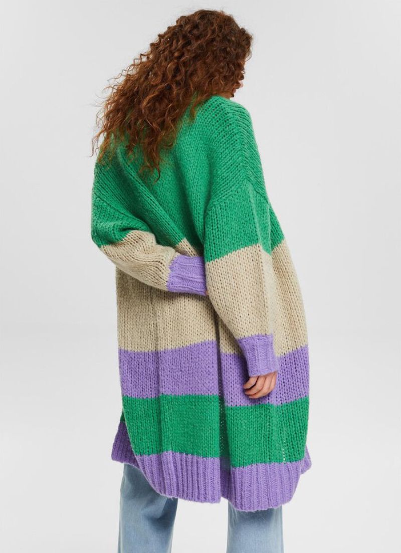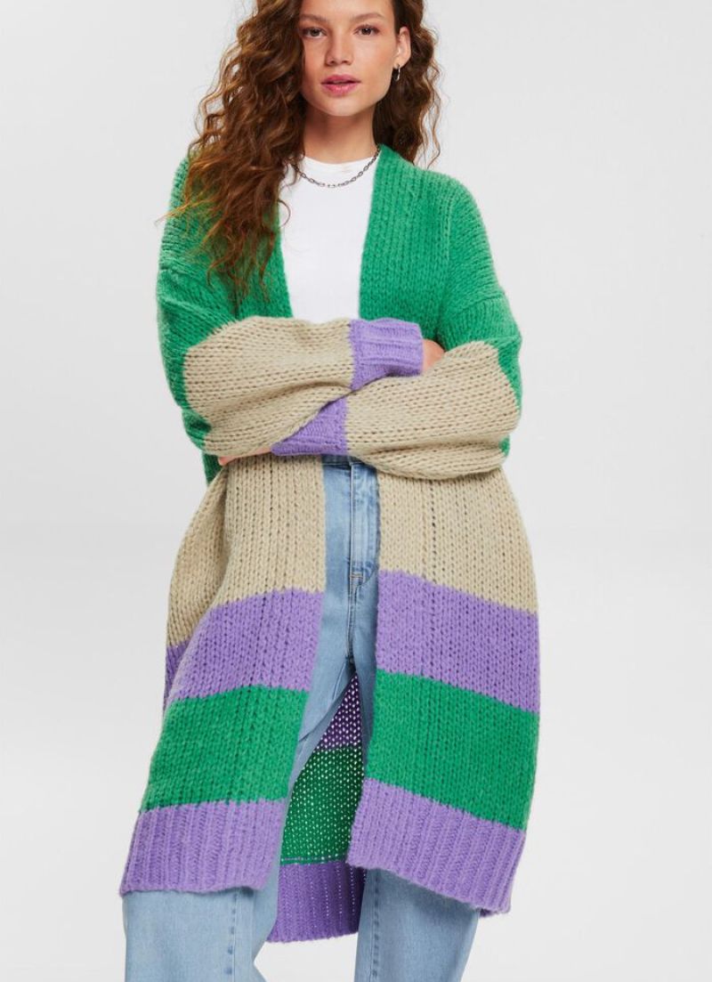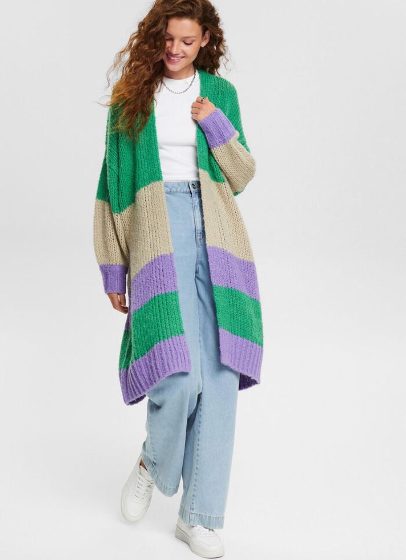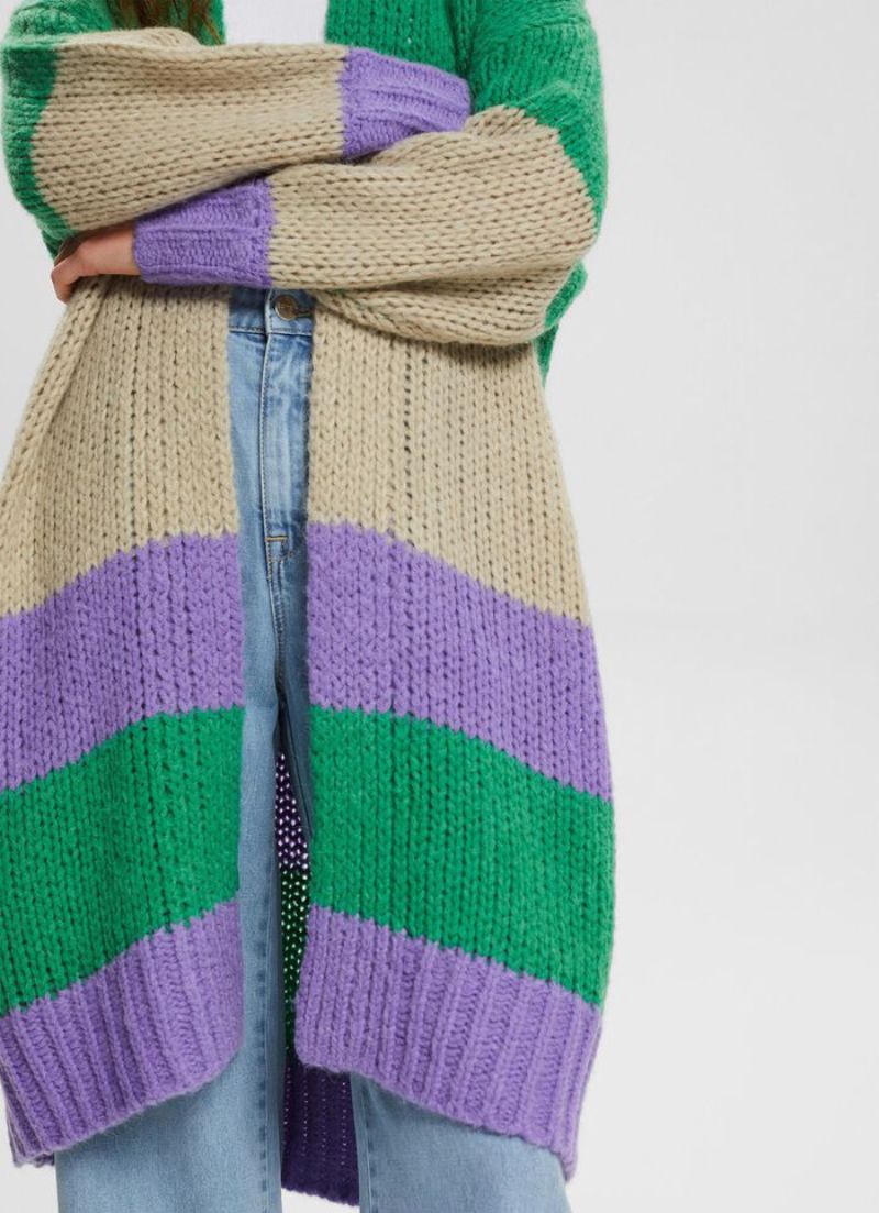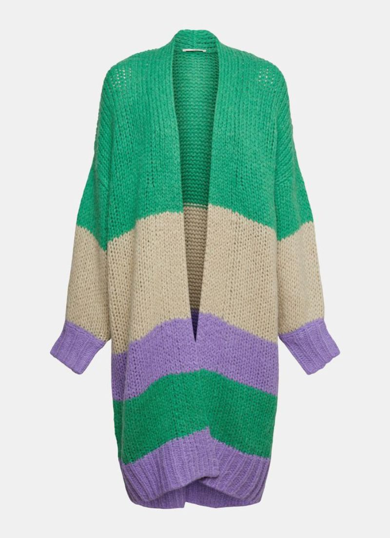 The Odette Cardigan is a long cardigan, with no closure and a stripe pattern.