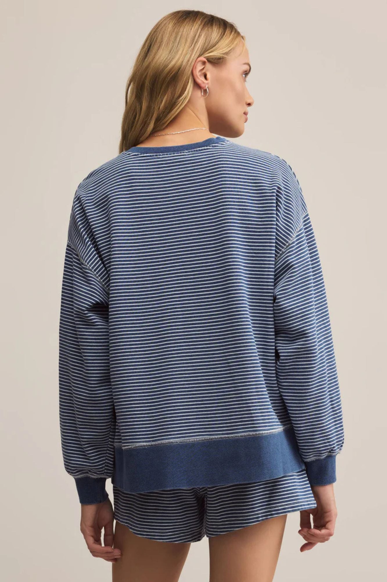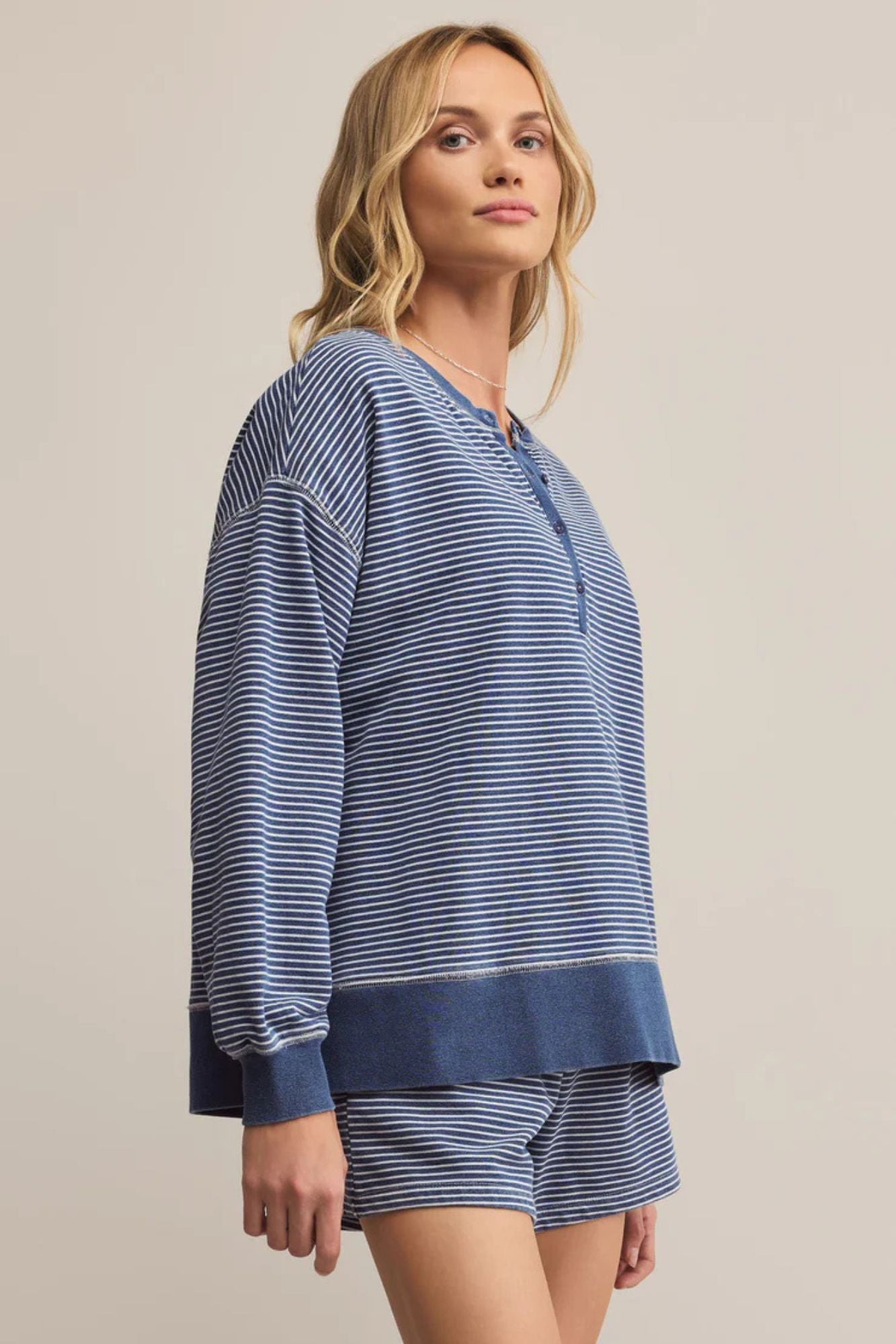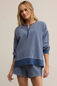 Add a fun twist to your everyday wardrobe with the Apollo Knit Denim Striped Sweatshirt. Featuring classic thin stripes and contrasting cuffs, waistband, and neckband, this relaxed henley offers playful texture and standout coverstitch details. Perfect for a casual-cool look you can enjoy all year long.