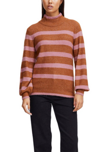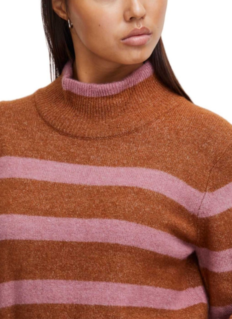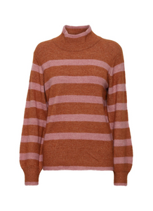 A lovely cozy knit from Ichi in the most beautiful burnt shade with pink stripes. It has a high neck with long sleeves and ribbed cuffs and hem for a good fit. Style it with a pair of jeans.