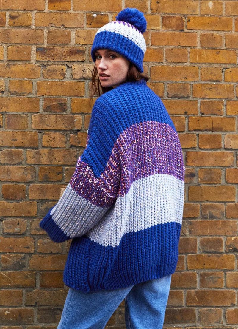 In a chunky oversized stripe using tones of blues and a unique colourful twist, Janie brings you electric retro vibes with a modern feel. In the relaxed slouchy shape that screams chuck on, style Janie over a mini dress & biker boots for a tougher look, or over jeans & an embroidery shirt for an effortless chic look. Oh and Janie has pockets too!