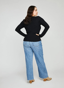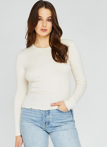 The Reid top is made of a stretchy ribbed fabric. Features include a crew neckline and delicate lettuce edge detailing along the sleeve and body hem