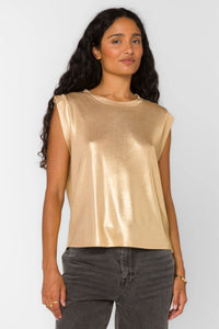 The Rossin Top is the perfect addition to your wardrobe. With its sleek and modern design, this women's metallic muscle tank adds a touch of glam to any outfit. The beautiful golden sheen of this top will make you stand out in any crowd.