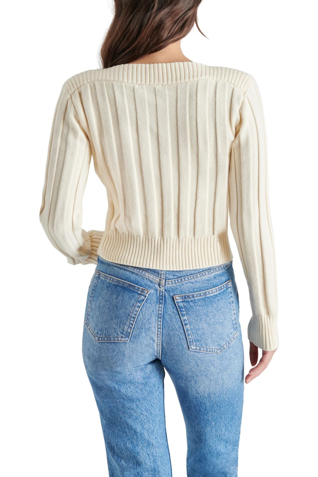 This Serra Sweater features wide ribbing, adding a unique texture and softness to the cropped design. The elongated neckline elevates the look and adds a touch of sophistication. Stay warm and stylish with this must-have piece for any wardrobe.